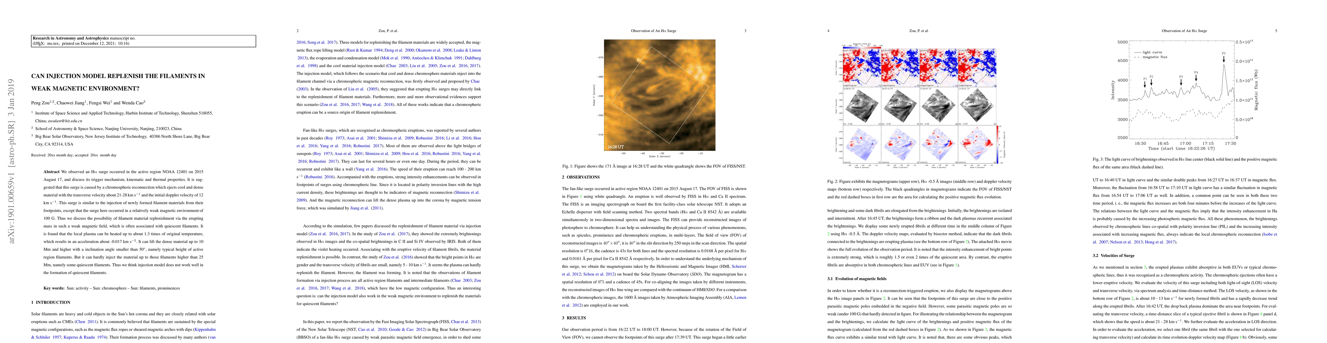 We observed an H$\alpha$ surge occurred in the active region NOAA 12401 on 2015 August 17, and discuss its trigger mechanism, kinematic and thermal properties. It is suggested that this surge is caused by a chromospheric reconnection which ejects cool and dense material with the transverse velocity about 21-28 km s$^{-1}$ and the initial doppler velocity of 12 km s$^{-1}$. This surge is similar to the injection of newly formed filament materials from their footpoints, except that the surge here occurred in a relatively weak magnetic environment of ~100 G. Thus we discuss the possibility of filament material replenishment via the erupting mass in such a weak magnetic field, which is often associated with quiescent filaments. It is found that the local plasma can be heated up to about 1.3 times of original temperature, which results in an acceleration about -0.017 km s$^{-2}$. It can lift the dense material up to 10 Mm and higher with a inclination angle smaller than 50$^{\circ}$, namely typical height of active region filaments. But it can hardly inject the material up to those filaments higher than 25 Mm, namely some quiescent filaments. Thus we think injection model does not work well in the formation of quiescent filaments.