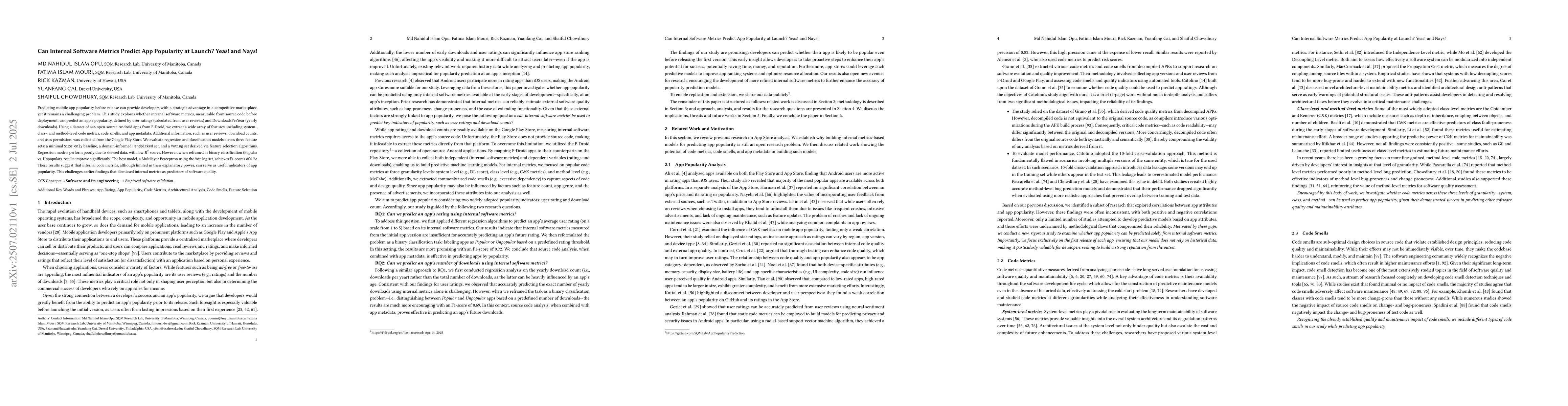 Predicting mobile app popularity before release can provide developers with a strategic advantage in a competitive marketplace, yet it remains a challenging problem. This study explores whether internal software metrics, measurable from source code before deployment, can predict an app's popularity, defined by user ratings (calculated from user reviews) and DownloadsPerYear (yearly downloads). Using a dataset of 446 open-source Android apps from F-Droid, we extract a wide array of features, including system-, class-, and method-level code metrics, code smells, and app metadata. Additional information, such as user reviews, download counts, and uses-permission, was collected from the Google Play Store. We evaluate regression and classification models across three feature sets: a minimal Size-only baseline, a domain-informed Handpicked set, and a Voting set derived via feature selection algorithms. Regression models perform poorly due to skewed data, with low $R^2$ scores. However, when reframed as binary classification (Popular vs. Unpopular), results improve significantly. The best model, a Multilayer Perceptron using the Voting set, achieves F1-scores of 0.72. These results suggest that internal code metrics, although limited in their explanatory power, can serve as useful indicators of app popularity. This challenges earlier findings that dismissed internal metrics as predictors of software quality.