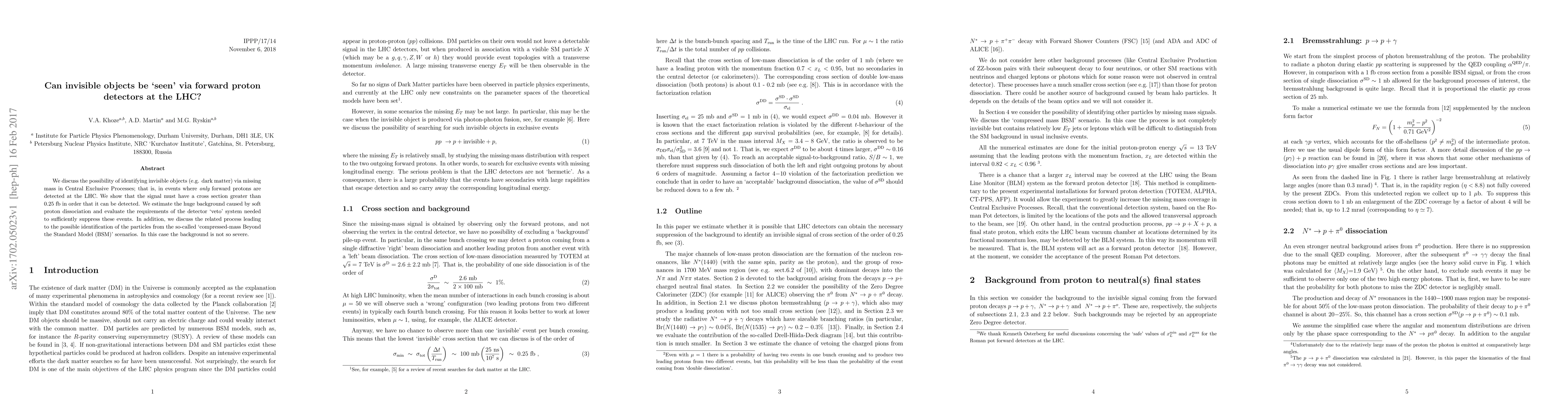 We discuss the possibility of identifying invisible objects (e.g. dark matter) via missing mass in Central Exclusive Processes; that is, in events where only forward protons are detected at the LHC. We show that the signal must have a cross section greater than 0.25 fb in order that it can be detected. We estimate the huge background caused by soft proton dissociation and evaluate the requirements of the detector `veto' system needed to sufficiently suppress these events. In addition, we discuss the related process leading to the possible identification of the particles from the so-called `compressed-mass Beyond the Standard Model (BSM)' scenarios. In this case the background is not so severe.