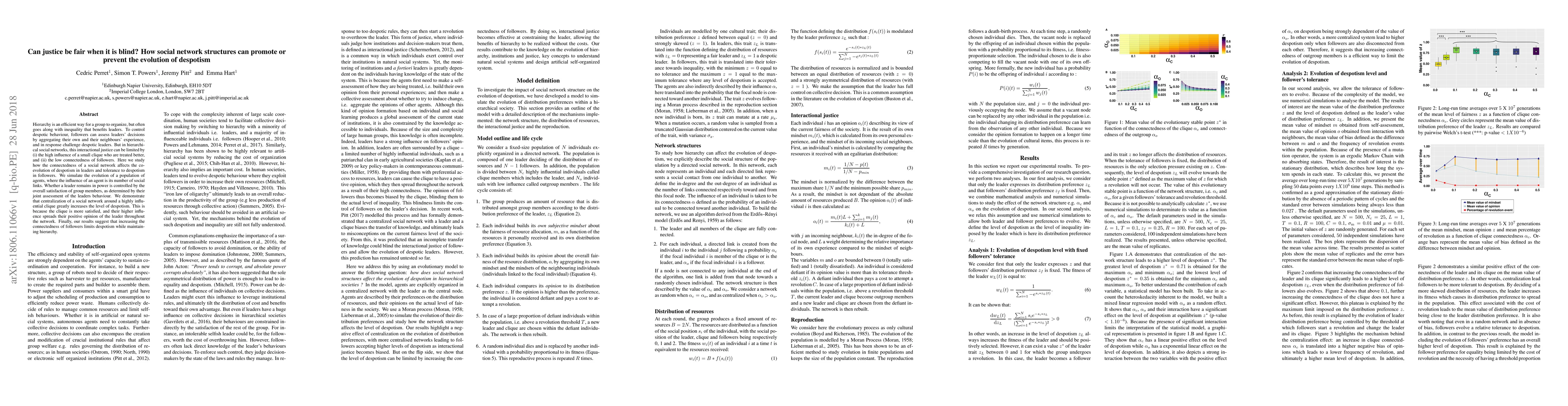 Hierarchy is an efficient way for a group to organize, but often goes along with inequality that benefits leaders. To control despotic behaviour, followers can assess leaders decisions by aggregating their own and their neighbours experience, and in response challenge despotic leaders. But in hierarchical social networks, this interactional justice can be limited by (i) the high influence of a small clique who are treated better, and (ii) the low connectedness of followers. Here we study how the connectedness of a social network affects the co-evolution of despotism in leaders and tolerance to despotism in followers. We simulate the evolution of a population of agents, where the influence of an agent is its number of social links. Whether a leader remains in power is controlled by the overall satisfaction of group members, as determined by their joint assessment of the leaders behaviour. We demonstrate that centralization of a social network around a highly influential clique greatly increases the level of despotism. This is because the clique is more satisfied, and their higher influence spreads their positive opinion of the leader throughout the network. Finally, our results suggest that increasing the connectedness of followers limits despotism while maintaining hierarchy.