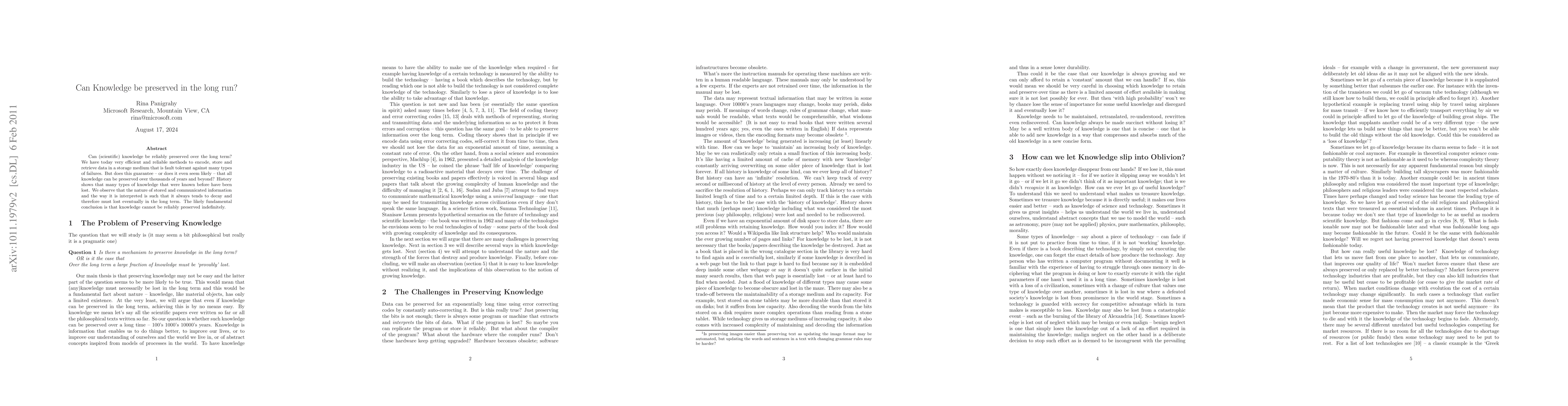 Can (scientific) knowledge be reliably preserved over the long term? We have today very efficient and reliable methods to encode, store and retrieve data in a storage medium that is fault tolerant against many types of failures. But does this guarantee -- or does it even seem likely -- that all knowledge can be preserved over thousands of years and beyond? History shows that many types of knowledge that were known before have been lost. We observe that the nature of stored and communicated information and the way it is interpreted is such that it always tends to decay and therefore must lost eventually in the long term. The likely fundamental conclusion is that knowledge cannot be reliably preserved indefinitely.