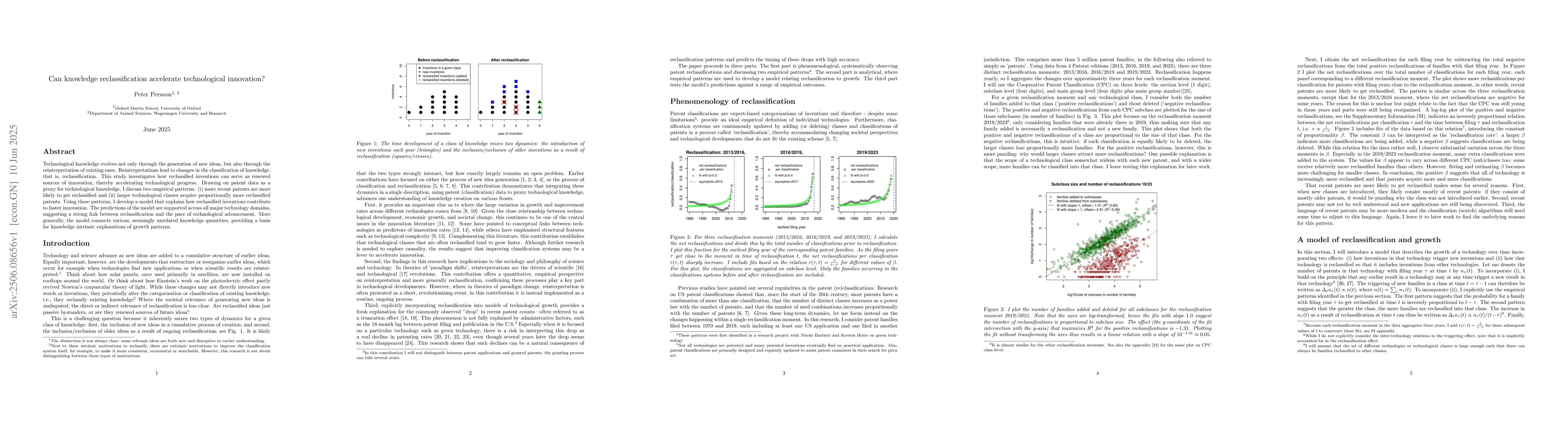 This study finds that reclassifying existing technological knowledge can accelerate innovation, supported by patent data showing recent and larger tech classes have more reclassified patents. A model explains how reclassified inventions boost innovation speed across all tech domains, linking diverse knowledge quantities to growth patterns.