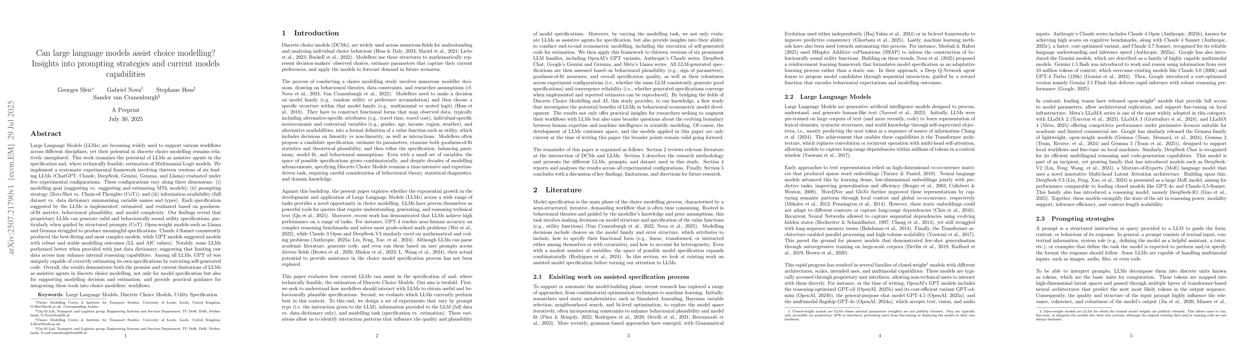 Large Language Models (LLMs) are widely used to support various workflows across different disciplines, yet their potential in choice modelling remains relatively unexplored. This work examines the potential of LLMs as assistive agents in the specification and, where technically feasible, estimation of Multinomial Logit models. We implement a systematic experimental framework involving thirteen versions of six leading LLMs (ChatGPT, Claude, DeepSeek, Gemini, Gemma, and Llama) evaluated under five experimental configurations. These configurations vary along three dimensions: modelling goal (suggesting vs. suggesting and estimating MNLs); prompting strategy (Zero-Shot vs. Chain-of-Thoughts); and information availability (full dataset vs. data dictionary only). Each LLM-suggested specification is implemented, estimated, and evaluated based on goodness-of-fit metrics, behavioural plausibility, and model complexity. Findings reveal that proprietary LLMs can generate valid and behaviourally sound utility specifications, particularly when guided by structured prompts. Open-weight models such as Llama and Gemma struggled to produce meaningful specifications. Claude 4 Sonnet consistently produced the best-fitting and most complex models, while GPT models suggested models with robust and stable modelling outcomes. Some LLMs performed better when provided with just data dictionary, suggesting that limiting raw data access may enhance internal reasoning capabilities. Among all LLMs, GPT o3 was uniquely capable of correctly estimating its own specifications by executing self-generated code. Overall, the results demonstrate both the promise and current limitations of LLMs as assistive agents in choice modelling, not only for model specification but also for supporting modelling decision and estimation, and provide practical guidance for integrating these tools into choice modellers' workflows.