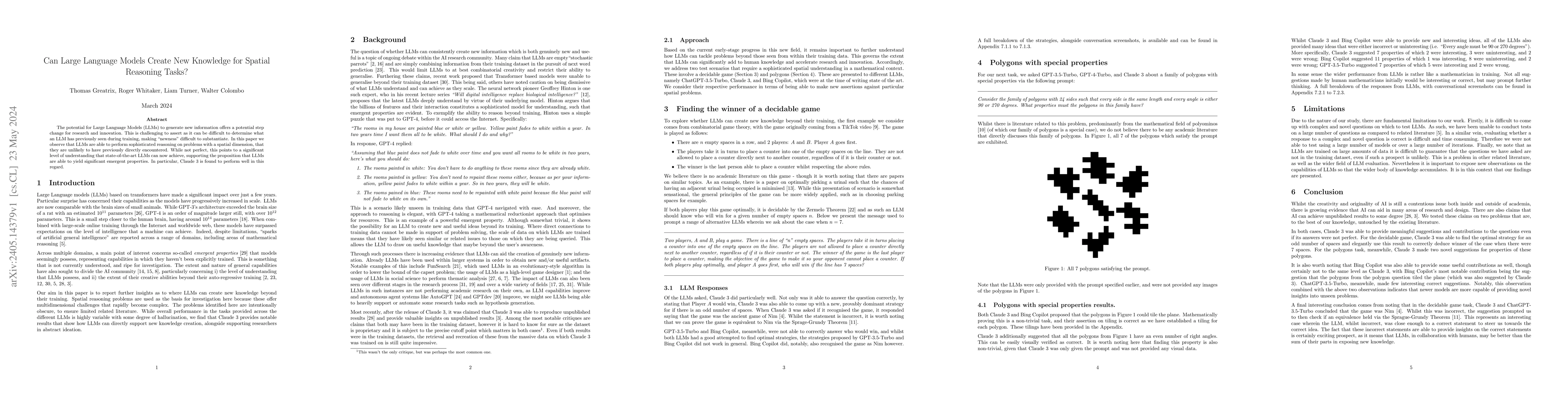 This paper explores whether Large Language Models (LLMs) can generate new knowledge for spatial reasoning tasks, finding that while not flawless, LLMs like Claude 3 exhibit sophisticated reasoning capabilities on spatial problems, indicating emergent understanding and potential for innovation.