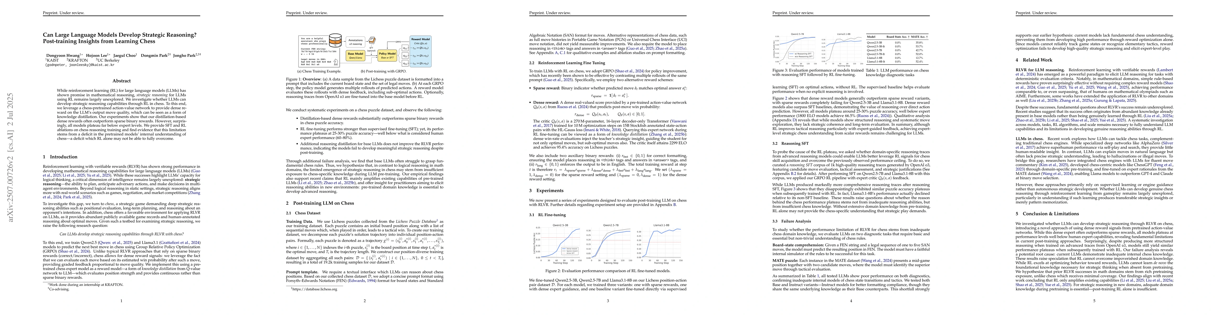 While reinforcement learning (RL) for large language models (LLMs) has shown promise in mathematical reasoning, strategic reasoning for LLMs using RL remains largely unexplored. We investigate whether LLMs can develop strategic reasoning capabilities through RL in chess. To this end, we leverage a chess-pretrained action-value network to provide dense reward on the LLM's output move quality, which can be seen as a form of knowledge distillation. Our experiments show that our distillation-based dense rewards often outperform sparse binary rewards. However, surprisingly, all models plateau far below expert levels. We provide SFT and RL ablations on chess reasoning training and find evidence that this limitation stems from a deficit in the pretrained models' internal understanding of chess--a deficit which RL alone may not be able to fully overcome.