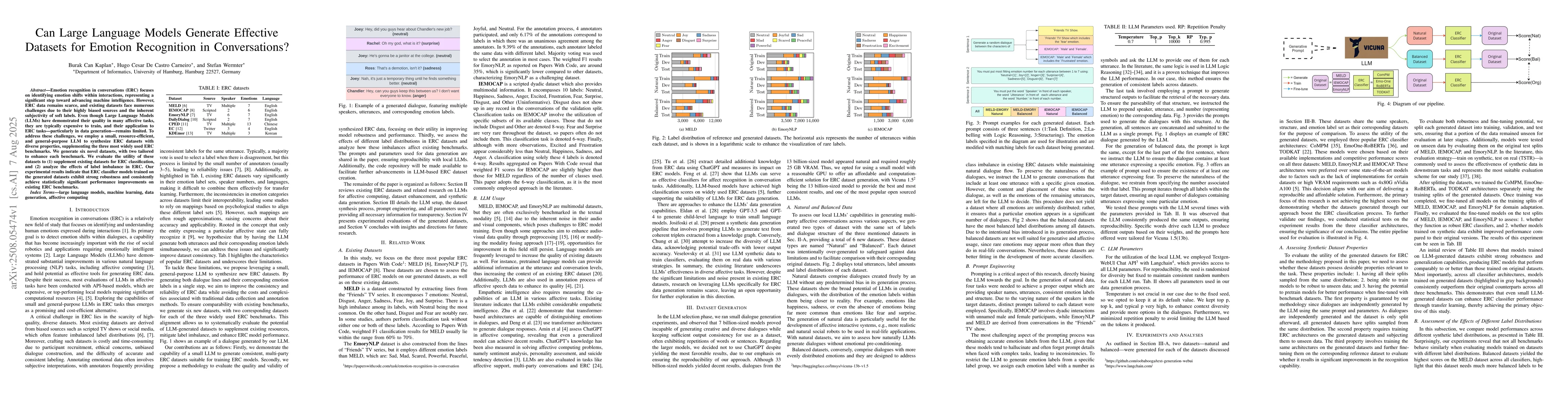 Emotion recognition in conversations (ERC) focuses on identifying emotion shifts within interactions, representing a significant step toward advancing machine intelligence. However, ERC data remains scarce, and existing datasets face numerous challenges due to their highly biased sources and the inherent subjectivity of soft labels. Even though Large Language Models (LLMs) have demonstrated their quality in many affective tasks, they are typically expensive to train, and their application to ERC tasks--particularly in data generation--remains limited. To address these challenges, we employ a small, resource-efficient, and general-purpose LLM to synthesize ERC datasets with diverse properties, supplementing the three most widely used ERC benchmarks. We generate six novel datasets, with two tailored to enhance each benchmark. We evaluate the utility of these datasets to (1) supplement existing datasets for ERC classification, and (2) analyze the effects of label imbalance in ERC. Our experimental results indicate that ERC classifier models trained on the generated datasets exhibit strong robustness and consistently achieve statistically significant performance improvements on existing ERC benchmarks.