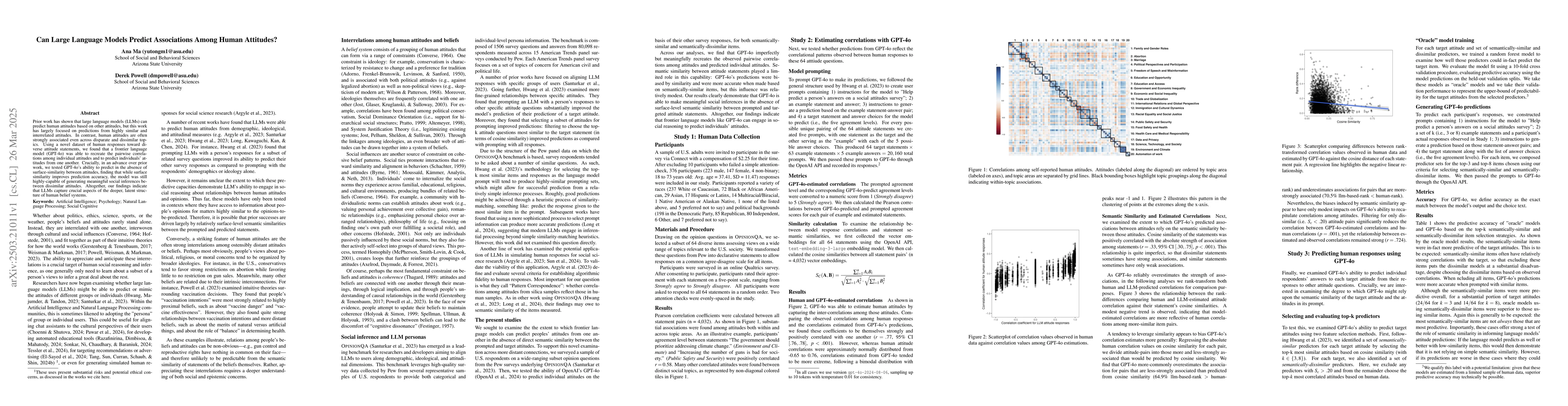 This study demonstrates that large language models, specifically GPT-4o, can predict associations among human attitudes across disparate topics, indicating the models' ability to capture the deeper, latent structure of human belief systems beyond surface-level similarities. The findings suggest that while surface similarity aids prediction, LLMs are still effective at generating meaningful social inferences between dissimilar attitudes.