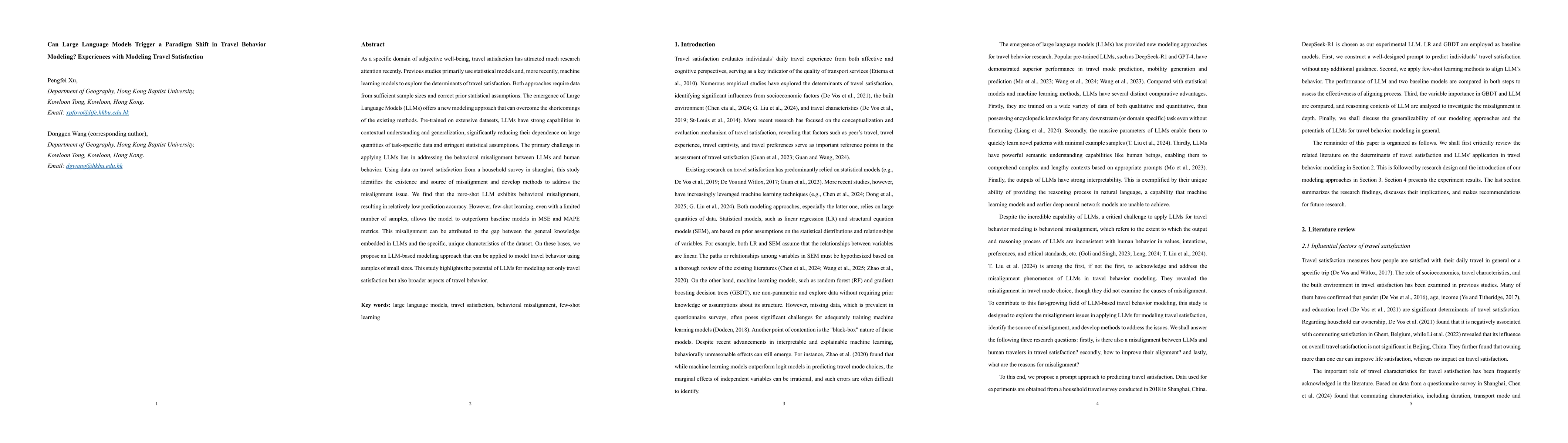 The study finds that LLMs exhibit behavioral misalignment but few-shot learning improves prediction accuracy, offering a promising approach for modeling travel satisfaction and behavior.
