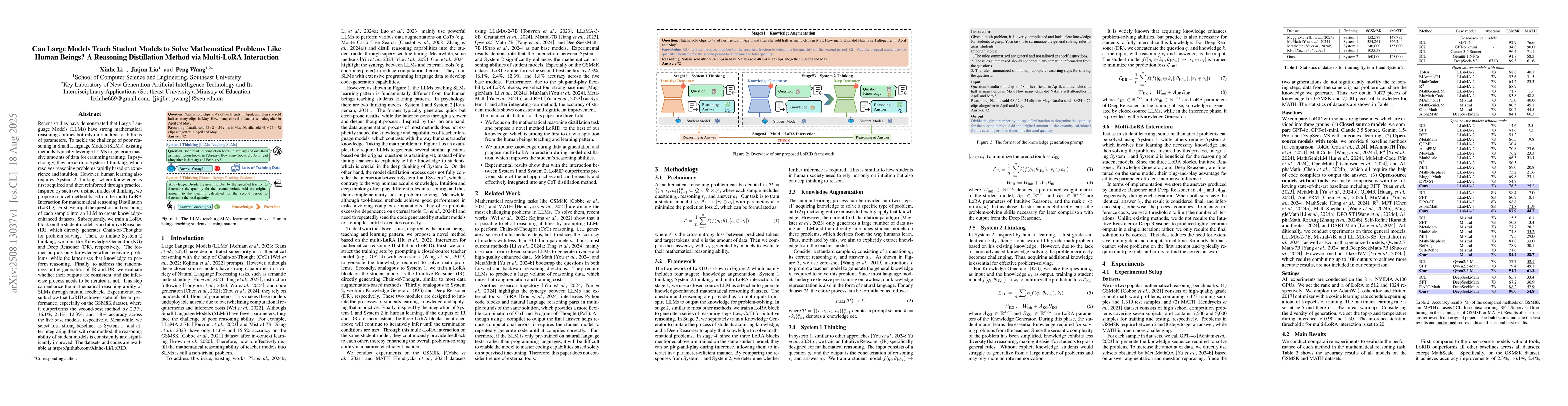 Recent studies have demonstrated that Large Language Models (LLMs) have strong mathematical reasoning abilities but rely on hundreds of billions of parameters. To tackle the challenge of poor reasoning in Small Language Models (SLMs), existing methods typically leverage LLMs to generate massive amounts of data for cramming training. In psychology, they are akin to System 1 thinking, which resolves reasoning problems rapidly based on experience and intuition. However, human learning also requires System 2 thinking, where knowledge is first acquired and then reinforced through practice. Inspired by such two distinct modes of thinking, we propose a novel method based on the multi-LoRA Interaction for mathematical reasoning Distillation (LoRID). First, we input the question and reasoning of each sample into an LLM to create knowledge-enhanced datasets. Subsequently, we train a LoRA block on the student model as an Intuitive Reasoner (IR), which directly generates Chain-of-Thoughts for problem-solving. Then, to imitate System 2 thinking, we train the Knowledge Generator (KG) and Deep Reasoner (DR), respectively. The former outputs only knowledge after receiving problems, while the latter uses that knowledge to perform reasoning. Finally, to address the randomness in the generation of IR and DR, we evaluate whether their outputs are consistent, and the inference process needs to be iterated if not. This step can enhance the mathematical reasoning ability of SLMs through mutual feedback. Experimental results show that LoRID achieves state-of-the-art performance, especially on the GSM8K dataset, where it outperforms the second-best method by 2.3%, 16.1%, 2.4%, 12.3%, and 1.8% accuracy across the five base models, respectively.