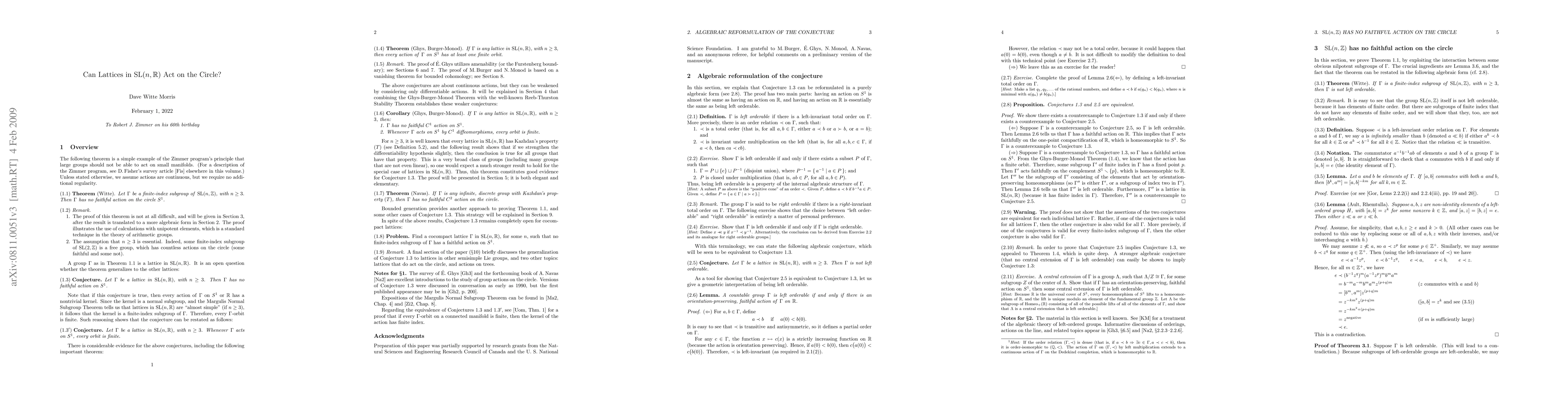 This expository paper describes the various methods that have yielded partial results on the conjecture that if n > 2, then no lattice in SL(n,R) has a faithful action on the circle (by homeomorphisms). Topics include amenability, Kazhdan's property (T), bounded cohomology, bounded generation, and the Reeb-Thurston Stability Theorem.