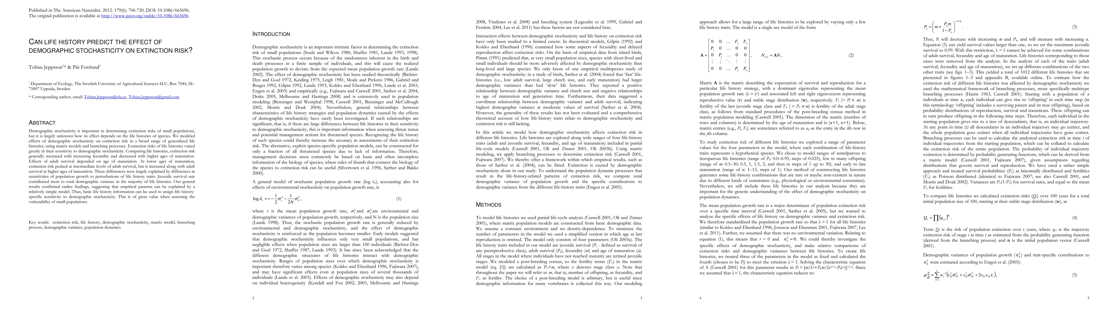 This study models how demographic stochasticity affects extinction risk across various life histories, finding that extinction risk increases with higher fecundity and decreases with later maturation. Adult survival's impact on extinction risk varies with maturation age, highlighting the importance of juvenile survival in demographic variance.