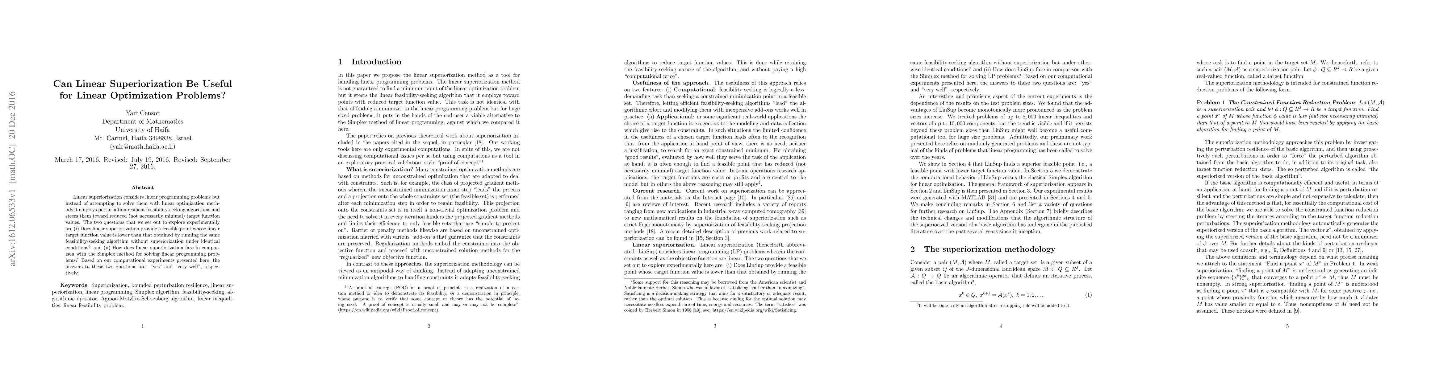 This paper explores linear superiorization as an alternative to traditional linear optimization methods, demonstrating that it can yield feasible points with lower target function values compared to standard feasibility-seeking algorithms. The study also finds that linear superiorization performs very well in comparison to the Simplex method.