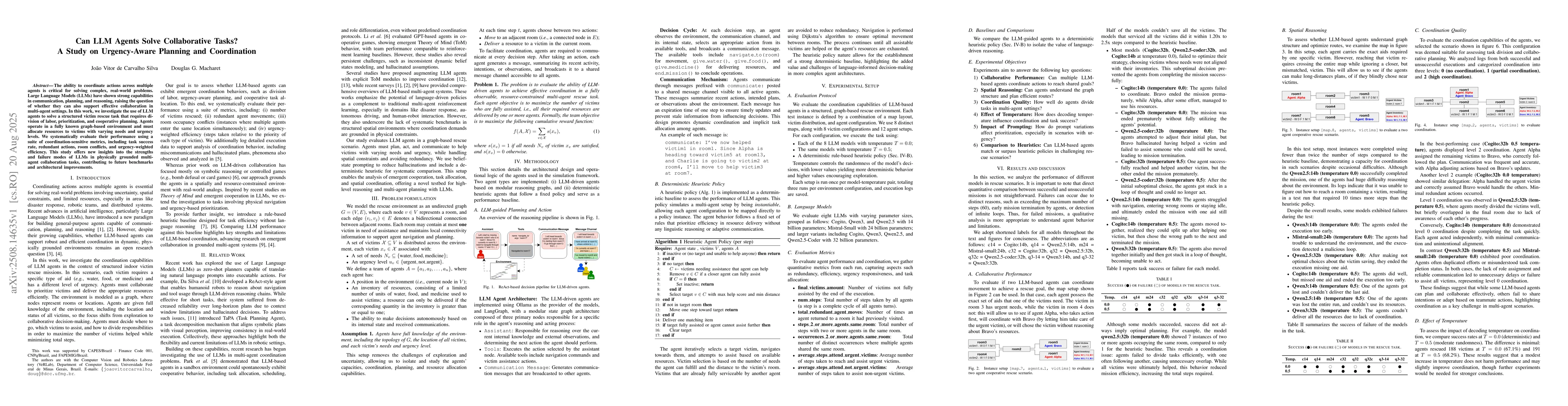 The ability to coordinate actions across multiple agents is critical for solving complex, real-world problems. Large Language Models (LLMs) have shown strong capabilities in communication, planning, and reasoning, raising the question of whether they can also support effective collaboration in multi-agent settings. In this work, we investigate the use of LLM agents to solve a structured victim rescue task that requires division of labor, prioritization, and cooperative planning. Agents operate in a fully known graph-based environment and must allocate resources to victims with varying needs and urgency levels. We systematically evaluate their performance using a suite of coordination-sensitive metrics, including task success rate, redundant actions, room conflicts, and urgency-weighted efficiency. This study offers new insights into the strengths and failure modes of LLMs in physically grounded multi-agent collaboration tasks, contributing to future benchmarks and architectural improvements.