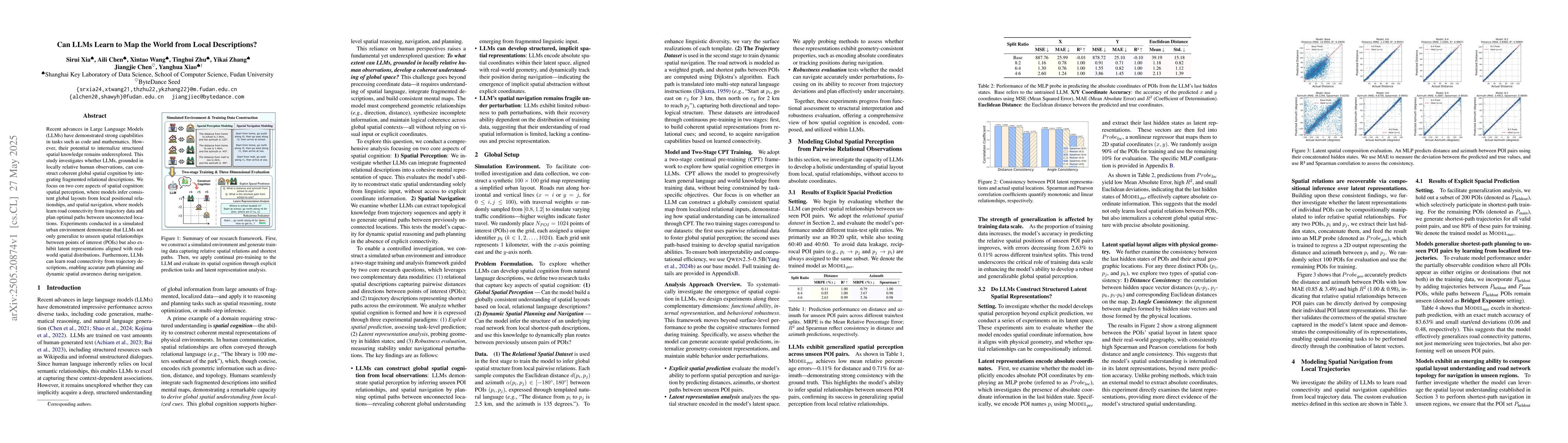 LLMs can learn to map the world from local descriptions, generalizing to unseen spatial relationships and exhibiting latent representations aligned with real-world spatial distributions. They also enable accurate path planning and dynamic spatial awareness during navigation in simulated environments.