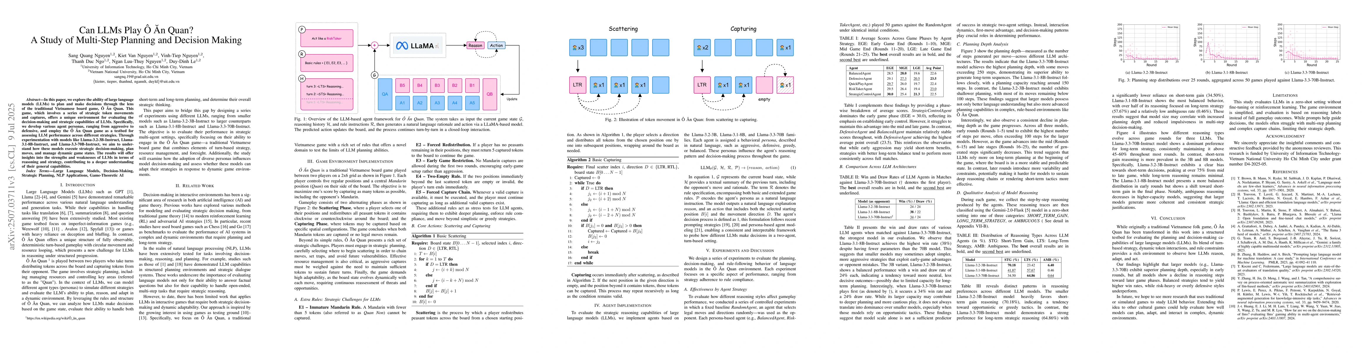 In this paper, we explore the ability of large language models (LLMs) to plan and make decisions through the lens of the traditional Vietnamese board game, \^O \u{A}n Quan. This game, which involves a series of strategic token movements and captures, offers a unique environment for evaluating the decision-making and strategic capabilities of LLMs. Specifically, we develop various agent personas, ranging from aggressive to defensive, and employ the \^O \u{A}n Quan game as a testbed for assessing LLM performance across different strategies. Through experimentation with models like Llama-3.2-3B-Instruct, Llama-3.1-8B-Instruct, and Llama-3.3-70B-Instruct, we aim to understand how these models execute strategic decision-making, plan moves, and manage dynamic game states. The results will offer insights into the strengths and weaknesses of LLMs in terms of reasoning and strategy, contributing to a deeper understanding of their general capabilities.