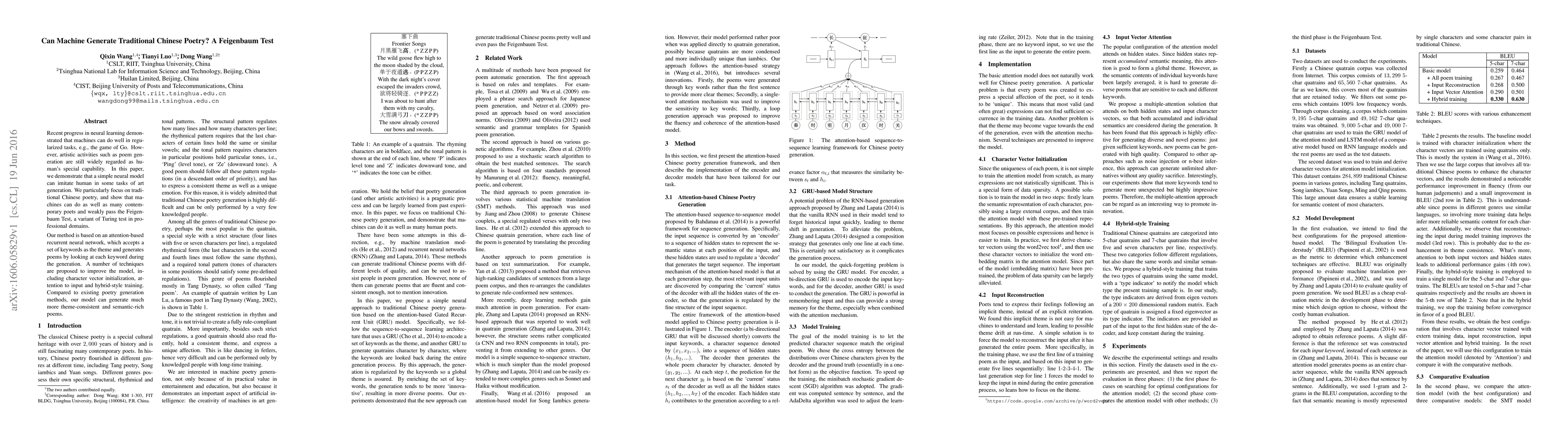 This paper demonstrates that a neural model can generate traditional Chinese poetry comparable to contemporary poets, passing a Feigenbaum Test. The model employs an attention-based recurrent neural network with techniques like character vector initialization, attention to input, and hybrid-style training to produce theme-consistent and semantically rich poems.