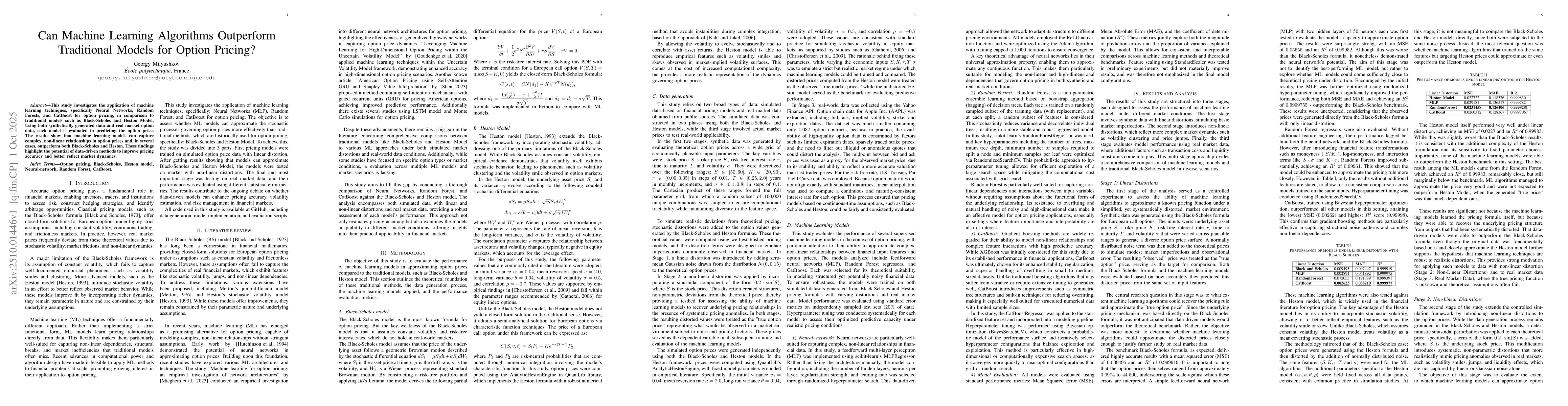 The study employed a three-stage methodology involving simulated data with linear and nonlinear distortions, as well as real-world market data. Machine learning models including feedforward neural networks, Random Forest, and CatBoost were trained and evaluated against traditional models like Black-Scholes and Heston.