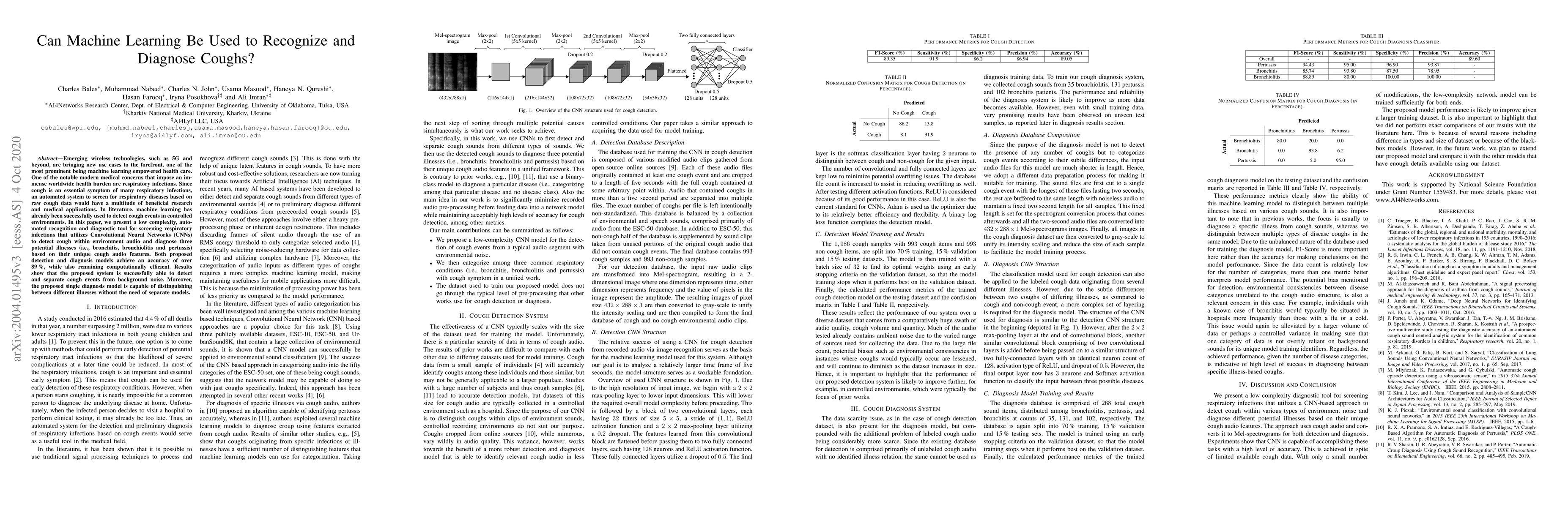 Emerging wireless technologies, such as 5G and beyond, are bringing new use cases to the forefront, one of the most prominent being machine learning empowered health care. One of the notable modern medical concerns that impose an immense worldwide health burden are respiratory infections. Since cough is an essential symptom of many respiratory infections, an automated system to screen for respiratory diseases based on raw cough data would have a multitude of beneficial research and medical applications. In literature, machine learning has already been successfully used to detect cough events in controlled environments. In this paper, we present a low complexity, automated recognition and diagnostic tool for screening respiratory infections that utilizes Convolutional Neural Networks (CNNs) to detect cough within environment audio and diagnose three potential illnesses (i.e., bronchitis, bronchiolitis and pertussis) based on their unique cough audio features. Both proposed detection and diagnosis models achieve an accuracy of over 89%, while also remaining computationally efficient. Results show that the proposed system is successfully able to detect and separate cough events from background noise. Moreover, the proposed single diagnosis model is capable of distinguishing between different illnesses without the need of separate models.