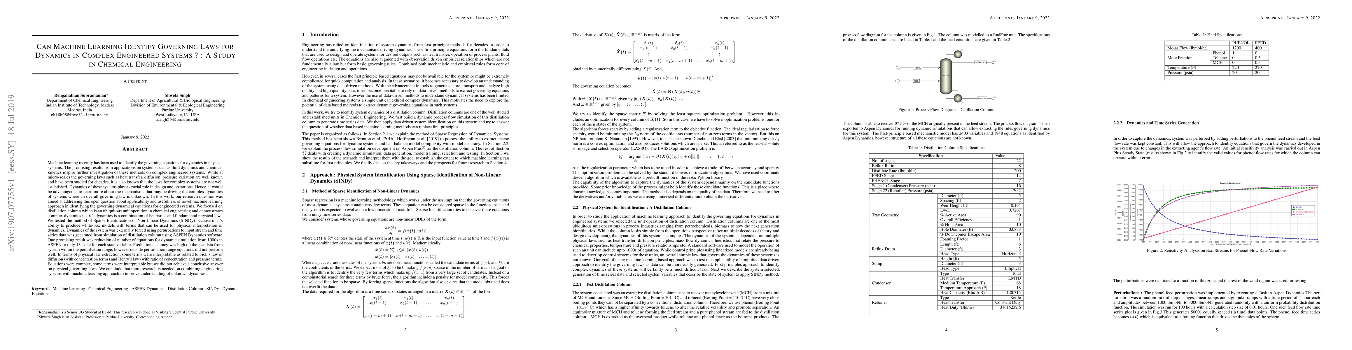 Machine learning recently has been used to identify the governing equations for dynamics in physical systems. The promising results from applications on systems such as fluid dynamics and chemical kinetics inspire further investigation of these methods on complex engineered systems. Dynamics of these systems play a crucial role in design and operations. Hence, it would be advantageous to learn about the mechanisms that may be driving the complex dynamics of systems. In this work, our research question was aimed at addressing this open question about applicability and usefulness of novel machine learning approach in identifying the governing dynamical equations for engineered systems. We focused on distillation column which is an ubiquitous unit operation in chemical engineering and demonstrates complex dynamics i.e. it's dynamics is a combination of heuristics and fundamental physical laws. We tested the method of Sparse Identification of Non-Linear Dynamics (SINDy) because of it's ability to produce white-box models with terms that can be used for physical interpretation of dynamics. Time series data for dynamics was generated from simulation of distillation column using ASPEN Dynamics. One promising result was reduction of number of equations for dynamic simulation from 1000s in ASPEN to only 13 - one for each state variable. Prediction accuracy was high on the test data from system within the perturbation range, however outside perturbation range equations did not perform well. In terms of physical law extraction, some terms were interpretable as related to Fick's law of diffusion (with concentration terms) and Henry's law (with ratio of concentration and pressure terms). While some terms were interpretable, we conclude that more research is needed on combining engineering systems with machine learning approach to improve understanding of governing laws for unknown dynamics.