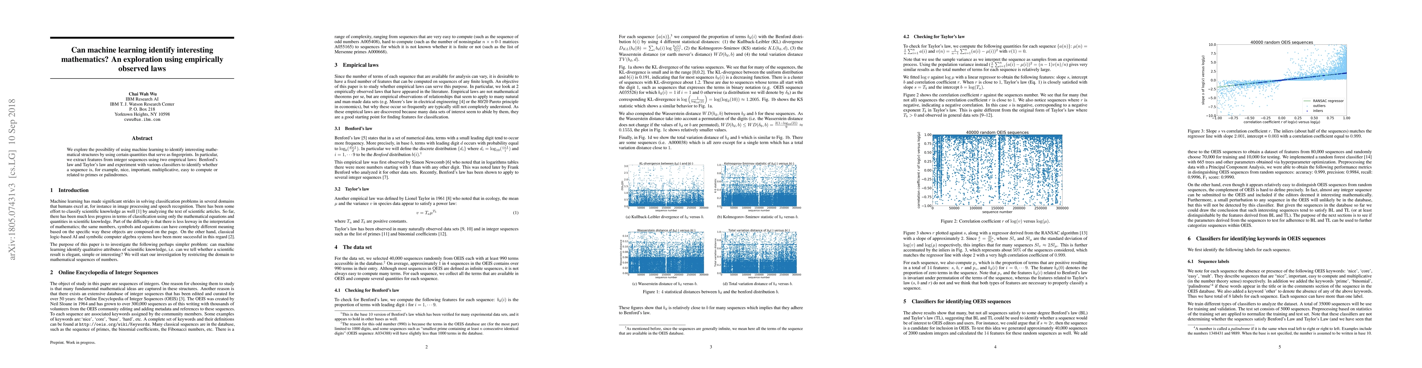 We explore the possibility of using machine learning to identify interesting mathematical structures by using certain quantities that serve as fingerprints. In particular, we extract features from integer sequences using two empirical laws: Benford's law and Taylor's law and experiment with various classifiers to identify whether a sequence is, for example, nice, important, multiplicative, easy to compute or related to primes or palindromes.