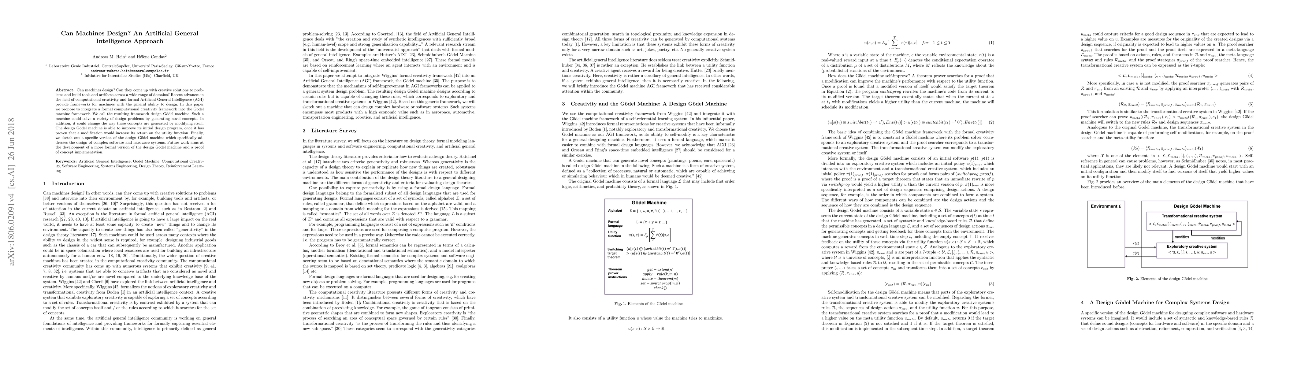 Can machines design? Can they come up with creative solutions to problems and build tools and artifacts across a wide range of domains? Recent advances in the field of computational creativity and formal Artificial General Intelligence (AGI) provide frameworks for machines with the general ability to design. In this paper we propose to integrate a formal computational creativity framework into the G\"odel machine framework. We call the resulting framework design G\"odel machine. Such a machine could solve a variety of design problems by generating novel concepts. In addition, it could change the way these concepts are generated by modifying itself. The design G\"odel machine is able to improve its initial design program, once it has proven that a modification would increase its return on the utility function. Finally, we sketch out a specific version of the design G\"odel machine which specifically addresses the design of complex software and hardware systems. Future work aims at the development of a more formal version of the design G\"odel machine and a proof of concept implementation.