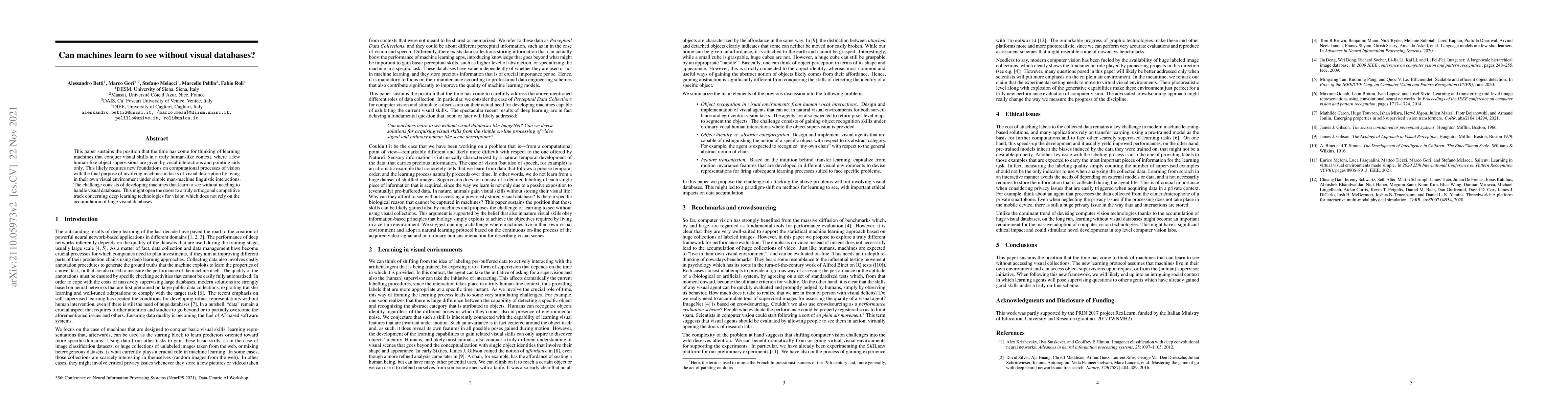 This paper explores the potential of machines to develop visual skills through minimal human-like supervision, primarily via vocal interactions and pointing, without relying on large visual databases. It proposes new computational foundations for vision to enable machines to perform visual description tasks through simple linguistic interactions.