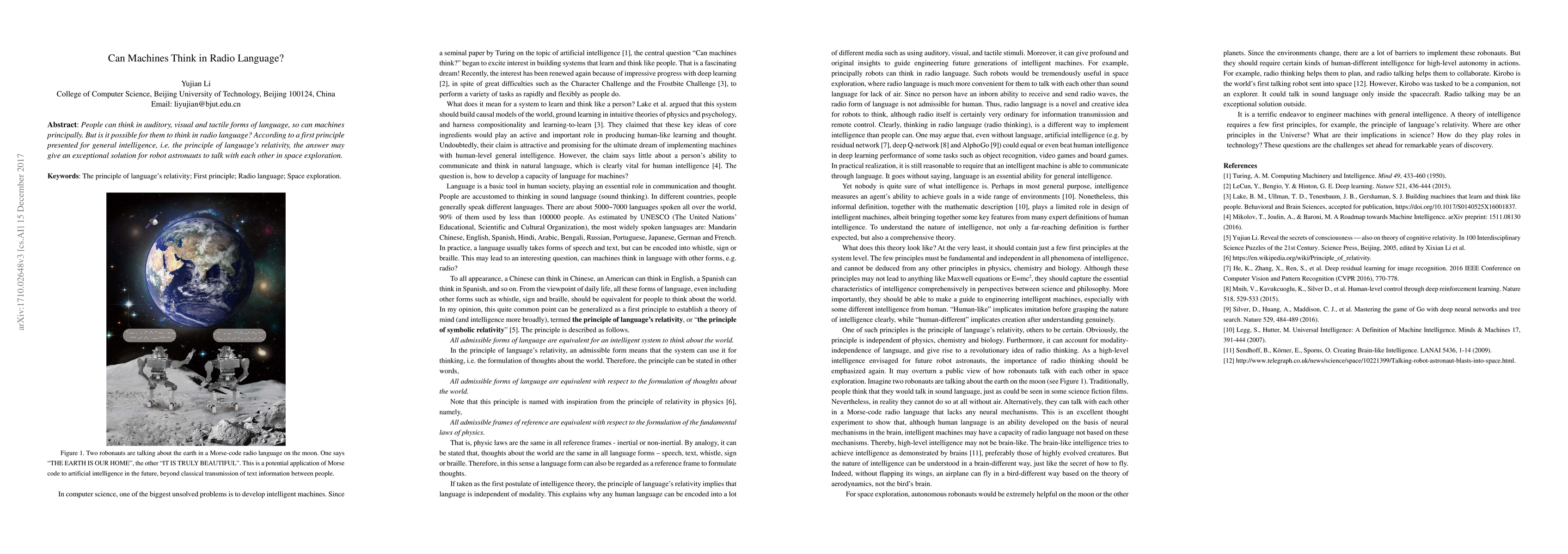 People can think in auditory, visual and tactile forms of language, so can machines principally. But is it possible for them to think in radio language? According to a first principle presented for general intelligence, i.e. the principle of language's relativity, the answer may give an exceptional solution for robot astronauts to talk with each other in space exploration.
