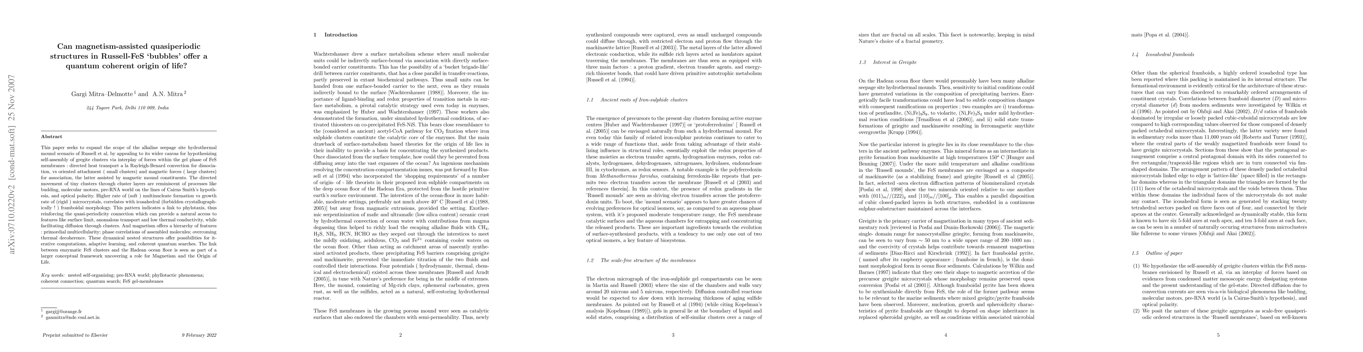 The paper proposes that magnetism-assisted quasiperiodic structures in Russell-FeS 'bubbles' could have facilitated self-assembly of gregite clusters, aiding in the origin of life. It suggests that magnetic forces, alongside heat transport and oriented attachment, played crucial roles in cluster association, potentially leading to primitive cellular structures and quantum coherence.