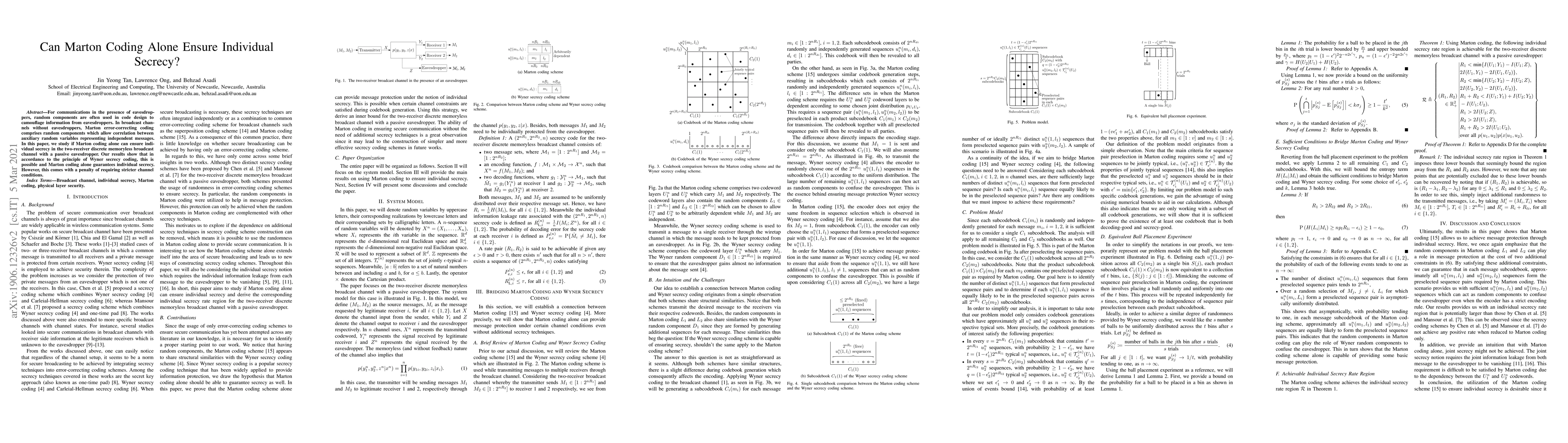 Marton coding alone can ensure individual secrecy in a two-receiver discrete memoryless broadcast channel with a passive eavesdropper, but requires stricter channel conditions.