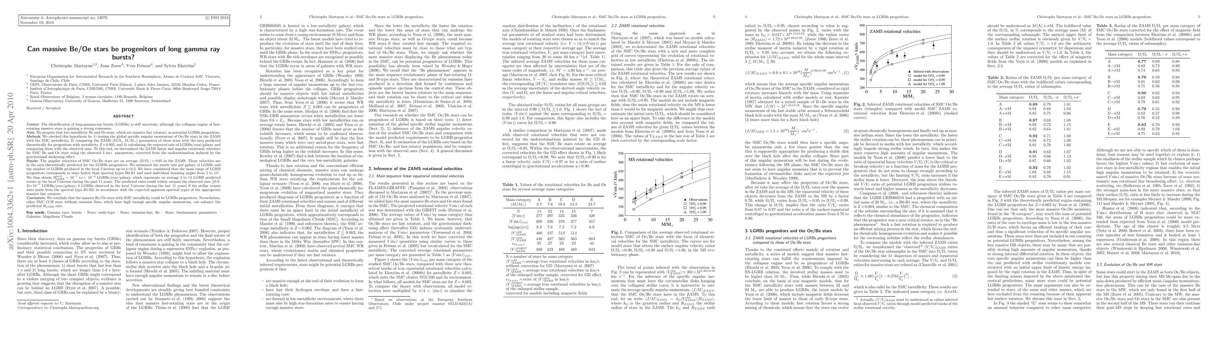 This paper investigates whether low-metallicity Be and Oe stars, characterized by their fast rotation, could be progenitors of long gamma-ray bursts (LGRBs). The study finds that the angular velocities of these stars align with theoretical predictions for LGRB progenitors, suggesting they could be potential sources.