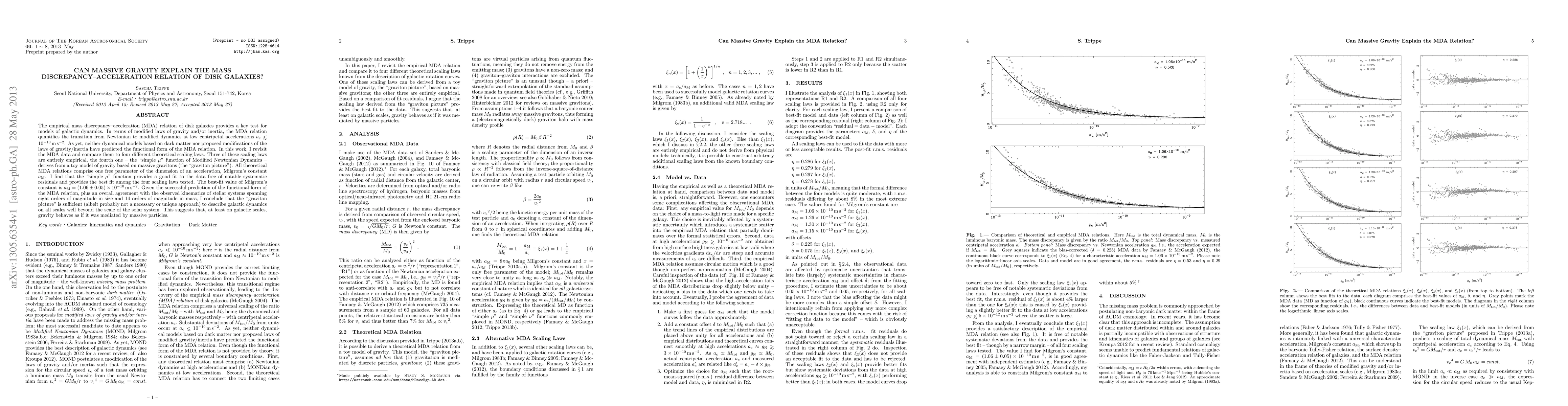 The paper investigates whether massive gravity can explain the mass discrepancy-acceleration (MDA) relation in disk galaxies, finding that a "simple mu" function based on a graviton model fits the empirical data well, suggesting massive gravity may describe galactic dynamics beyond solar system scales.