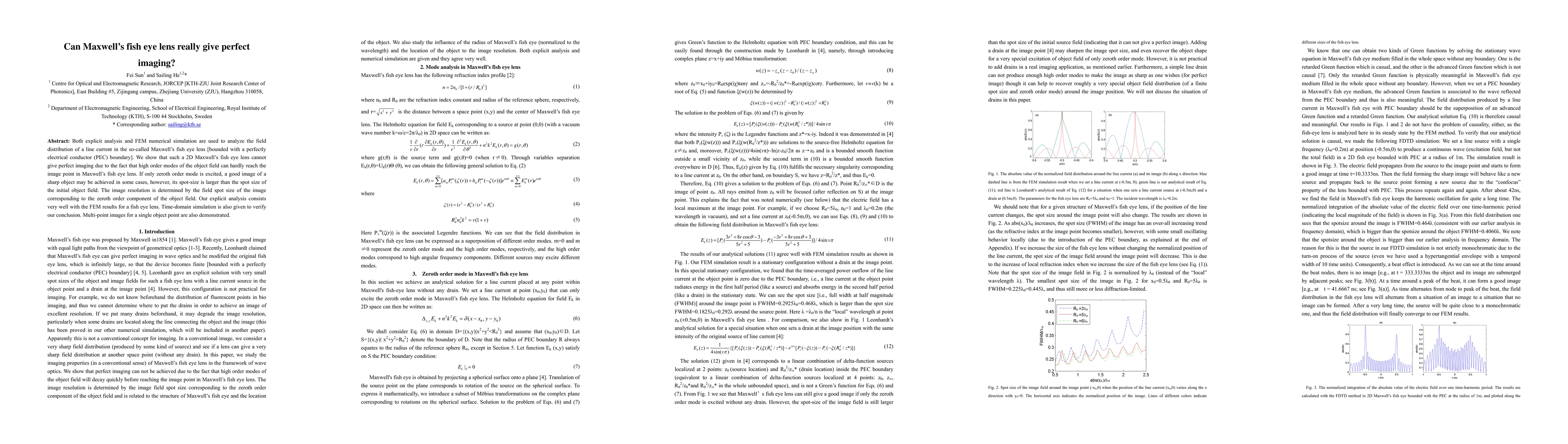 Both explicit analysis and FEM numerical simulation are used to analyze the field distribution of a line current in the so-called Maxwell's fish eye lens [bounded with a perfectly electrical conductor (PEC) boundary]. We show that such a 2D Maxwell's fish eye lens cannot give perfect imaging due to the fact that high order modes of the object field can hardly reach the image point in Maxwell's fish eye lens. If only zeroth order mode is excited, a good image of a sharp object may be achieved in some cases, however, its spot-size is larger than the spot size of the initial object field. The image resolution is determined by the field spot size of the image corresponding to the zeroth order component of the object field. Our explicit analysis consists very well with the FEM results for a fish eye lens. Time-domain simulation is also given to verify our conclusion. Multi-point images for a single object point are also demonstrated.