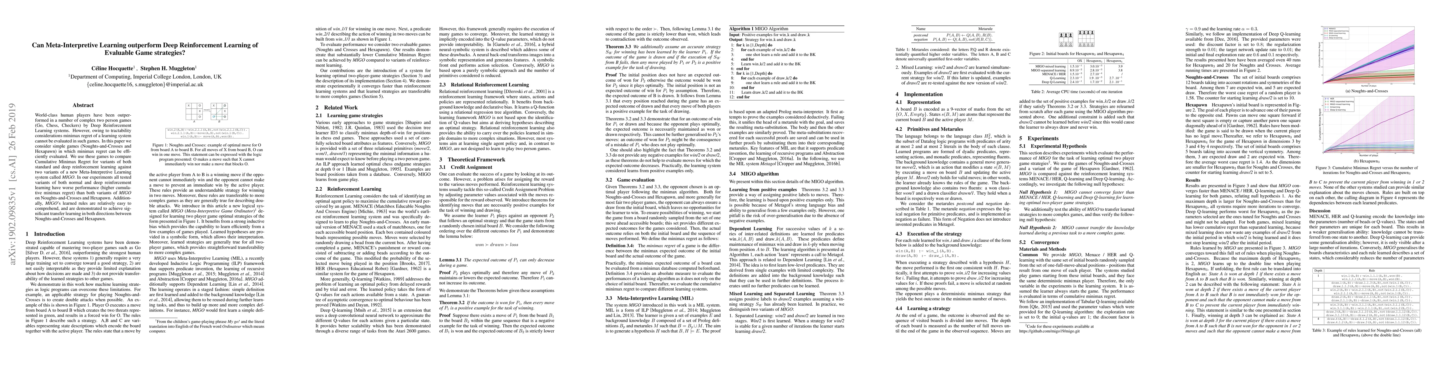 This paper compares Meta-Interpretive Learning (MIGO) to Deep Reinforcement Learning in simple games where minimax regret can be evaluated, finding MIGO outperforms both standard and deep reinforcement learning in terms of cumulative minimax regret. MIGO also demonstrates easy-to-understand learned rules and significant transfer learning between games.