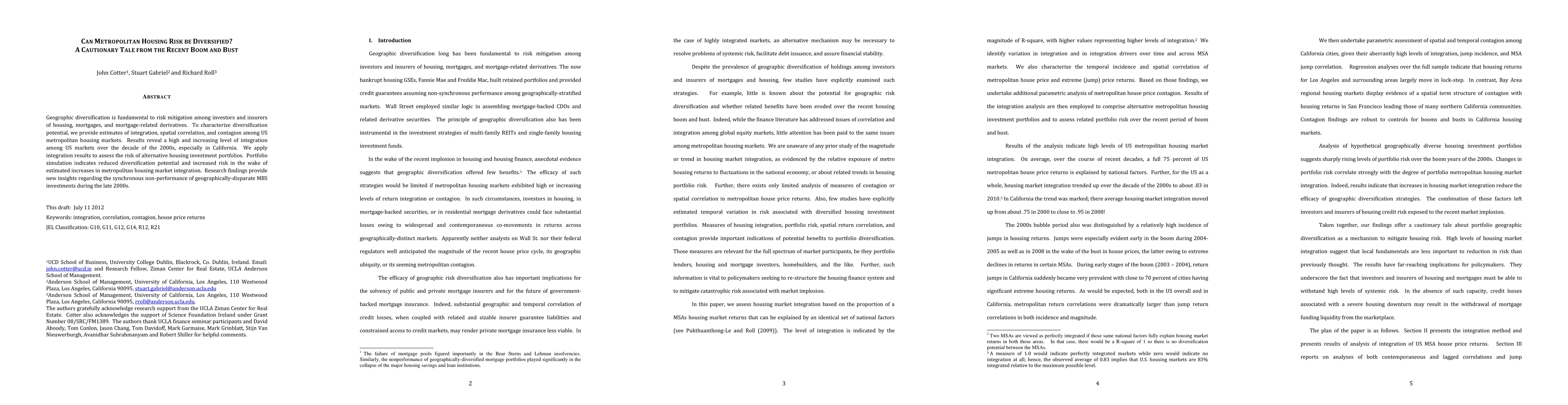 Geographic diversification is fundamental to risk mitigation among investors and insurers of housing, mortgages, and mortgage-related derivatives. To characterize diversification potential, we provide estimates of integration, spatial correlation, and contagion among US metropolitan housing markets. Results reveal a high and increasing level of integration among US markets over the decade of the 2000s, especially in California. We apply integration results to assess the risk of alternative housing investment portfolios. Portfolio simulation indicates reduced diversification potential and increased risk in the wake of estimated increases in metropolitan housing market integration. Research findings provide new insights regarding the synchronous non-performance of geographically-disparate MBS investments during the late 2000s.
