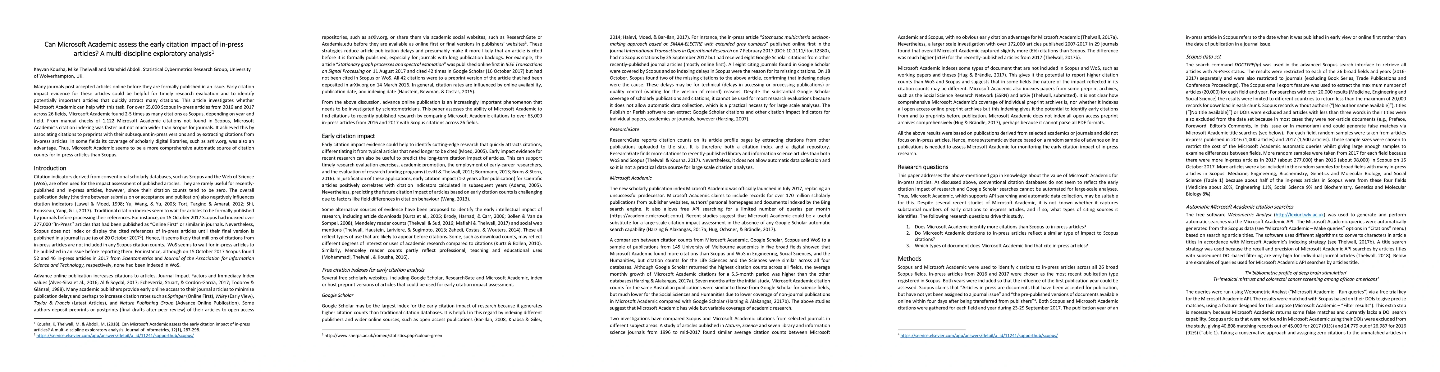 Microsoft Academic can provide a more comprehensive count of early citations for in-press articles compared to Scopus, though its indexing is faster rather than significantly wider. This is due to its ability to link citations to preprints and extract citations from in-press articles, along with better coverage of scholarly digital libraries.