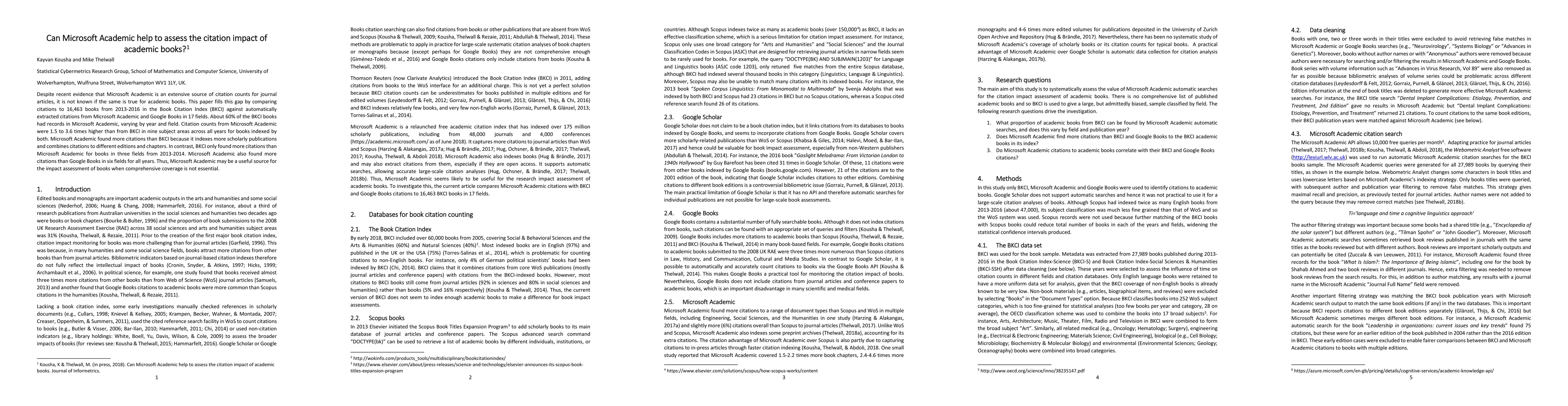 Microsoft Academic provides higher citation counts for academic books compared to the Book Citation Index, likely due to its broader indexing of scholarly publications and comprehensive citation aggregation. While it may not be as exhaustive as BKCI in some fields, it is generally more effective for assessing the citation impact of books.