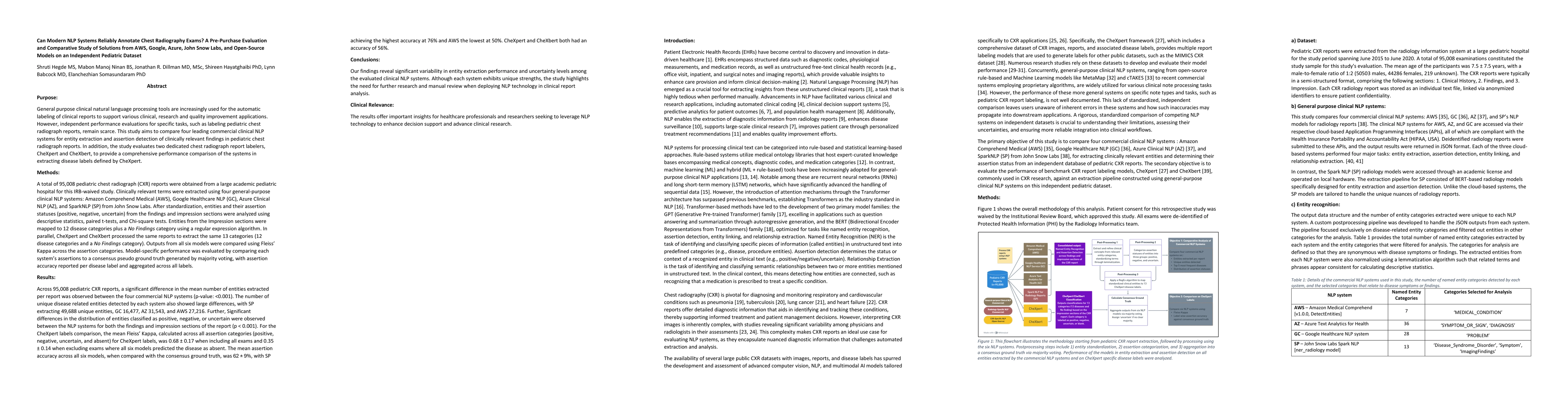 The study compared four commercial clinical NLP systems (AWS, GC, AZ, SP) and two dedicated chest radiograph report labelers (CheXpert, CheXbert) on 95,008 pediatric CXR reports, evaluating entity extraction and assertion detection accuracy.