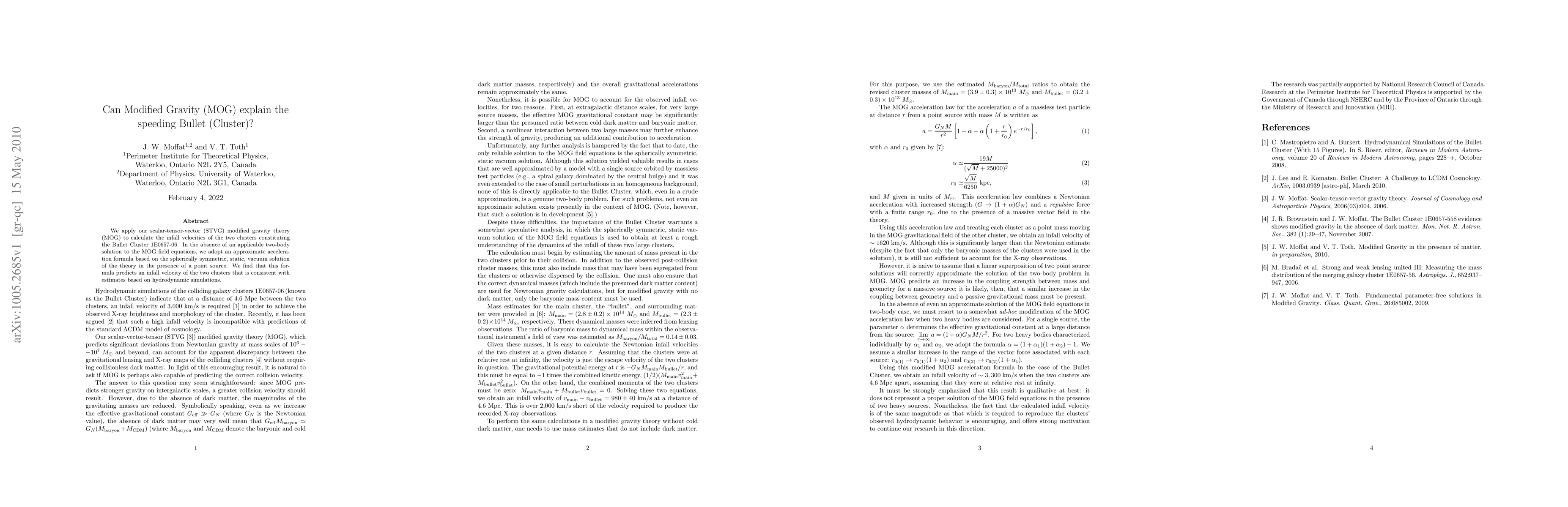 The authors demonstrated the potential of modified gravity theory (MOG) to explain the observed properties of the Bullet Cluster without requiring dark matter.