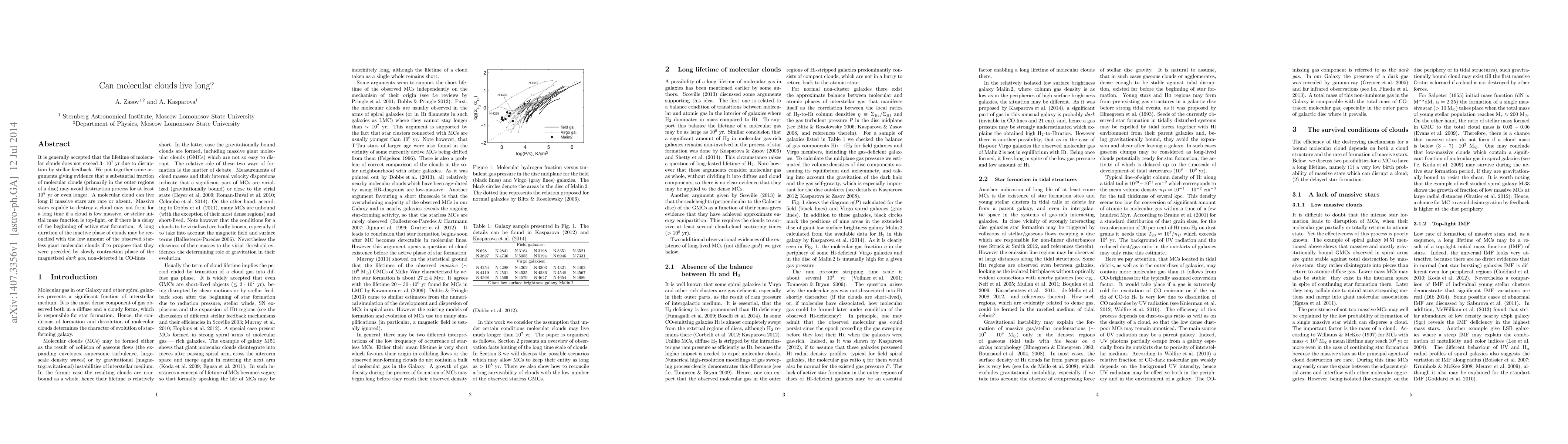 It is generally accepted that the lifetime of molecular clouds does not exceed $3\cdot 10^7$ yr due to disruption by stellar feedback. We put together some arguments giving evidence that a substantial fraction of molecular clouds (primarily in the outer regions of a disc) may avoid destruction process for at least $10^8$ yr or even longer. A molecular cloud can live long if massive stars are rare or absent. Massive stars capable to destroy a cloud may not form for a long time if a cloud is low massive, or stellar initial mass function is top-light, or if there is a delay of the beginning of active star formation. A long duration of the inactive phase of clouds may be reconciled with the low amount of the observed starless giant molecular clouds if to propose that they were preceded by slowly contraction phase of the magnetized dark gas, non-detected in CO-lines.
