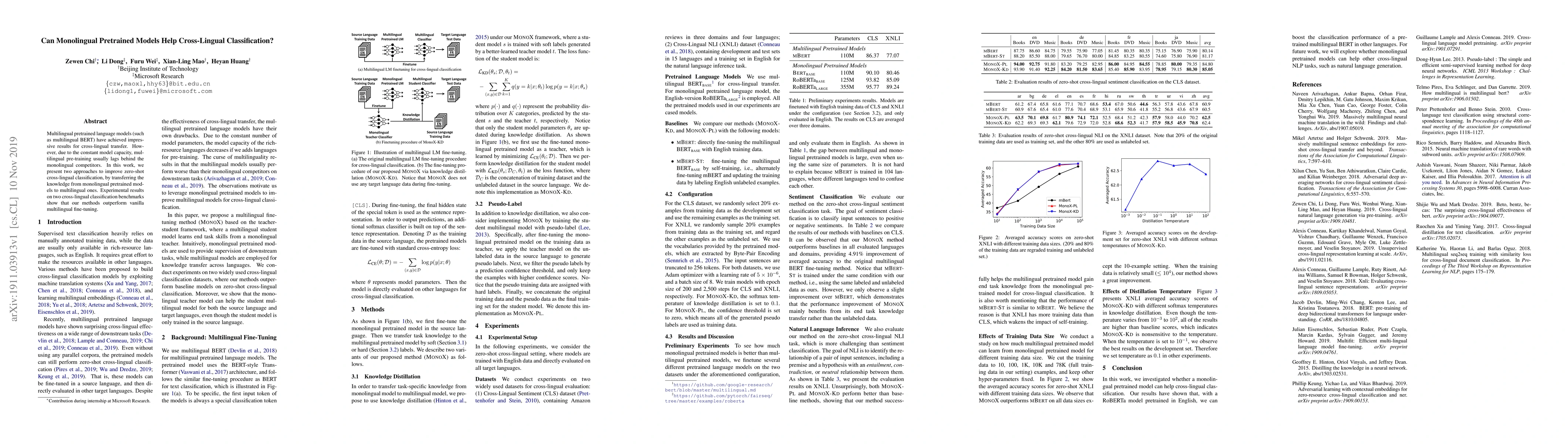 Multilingual pretrained language models (such as multilingual BERT) have achieved impressive results for cross-lingual transfer. However, due to the constant model capacity, multilingual pre-training usually lags behind the monolingual competitors. In this work, we present two approaches to improve zero-shot cross-lingual classification, by transferring the knowledge from monolingual pretrained models to multilingual ones. Experimental results on two cross-lingual classification benchmarks show that our methods outperform vanilla multilingual fine-tuning.