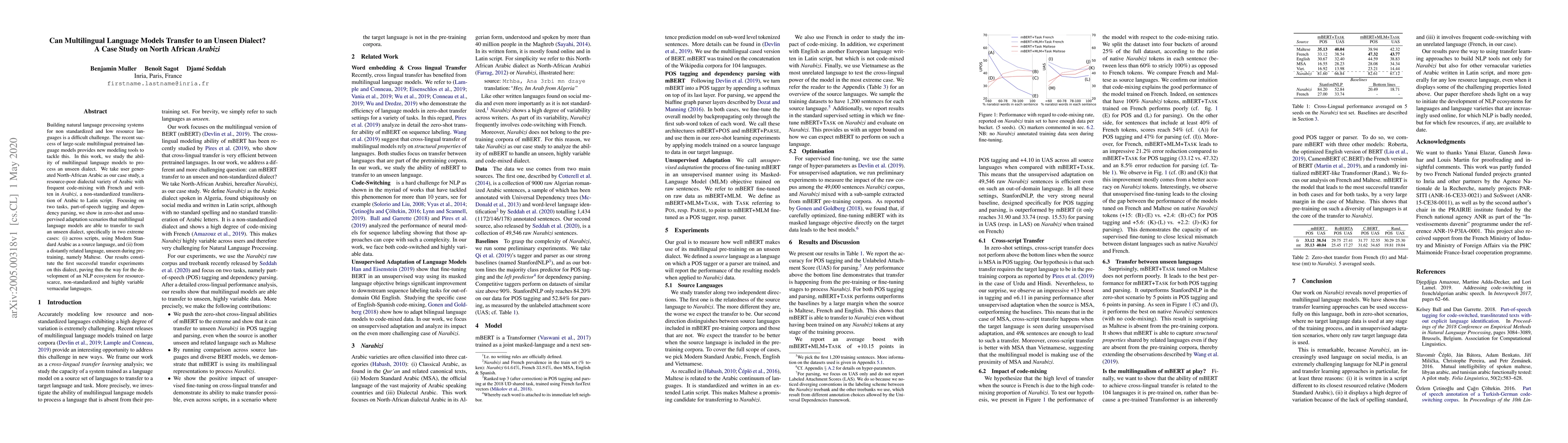 Building natural language processing systems for non standardized and low resource languages is a difficult challenge. The recent success of large-scale multilingual pretrained language models provides new modeling tools to tackle this. In this work, we study the ability of multilingual language models to process an unseen dialect. We take user generated North-African Arabic as our case study, a resource-poor dialectal variety of Arabic with frequent code-mixing with French and written in Arabizi, a non-standardized transliteration of Arabic to Latin script. Focusing on two tasks, part-of-speech tagging and dependency parsing, we show in zero-shot and unsupervised adaptation scenarios that multilingual language models are able to transfer to such an unseen dialect, specifically in two extreme cases: (i) across scripts, using Modern Standard Arabic as a source language, and (ii) from a distantly related language, unseen during pretraining, namely Maltese. Our results constitute the first successful transfer experiments on this dialect, paving thus the way for the development of an NLP ecosystem for resource-scarce, non-standardized and highly variable vernacular languages.