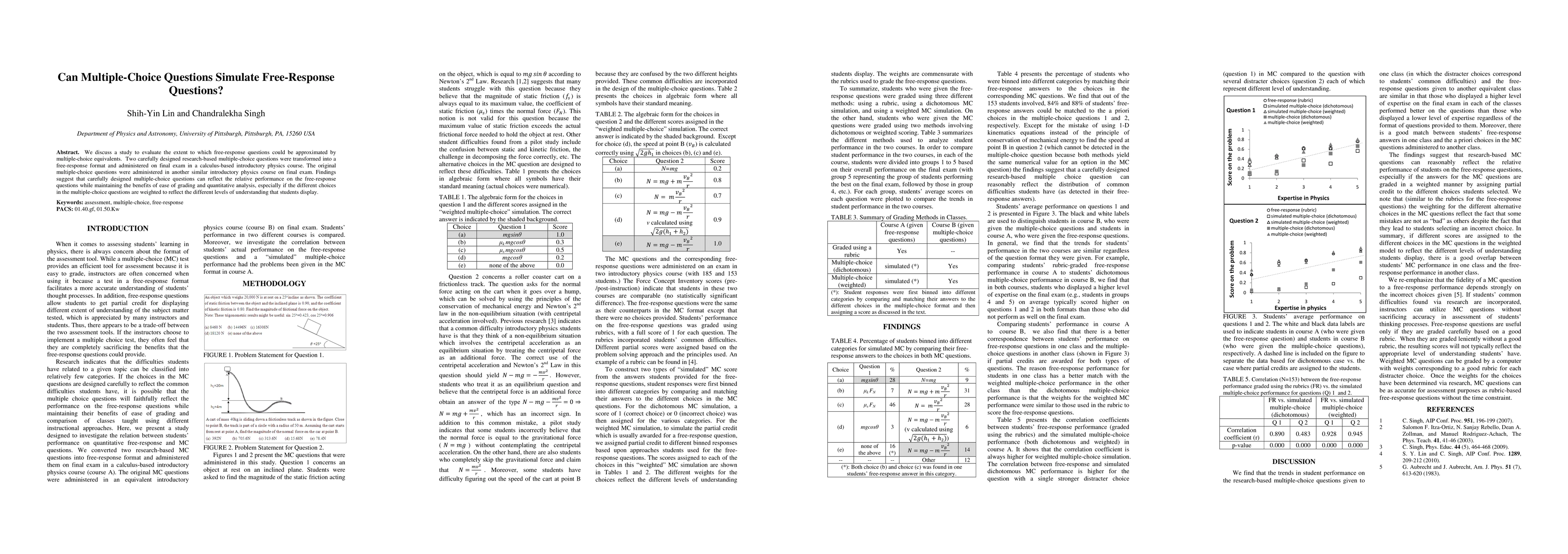 This study evaluates if multiple-choice questions can simulate free-response questions, finding that well-designed multiple-choice questions can reflect student performance similarly to free-response questions, while offering easier grading and quantitative analysis, especially with weighted choices.