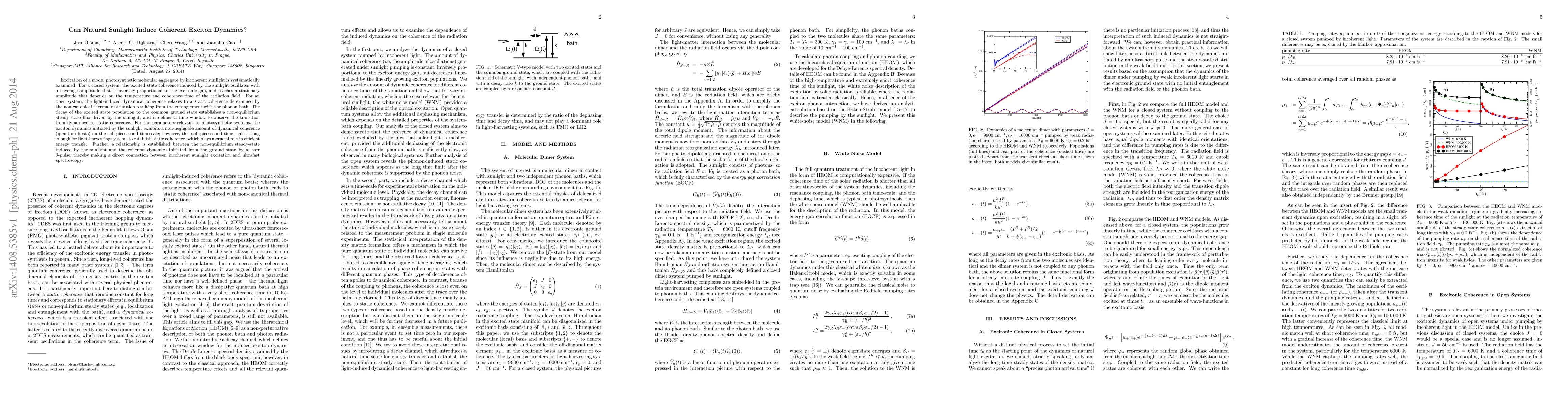 Excitation of a model photosynthetic molecular aggregate by incoherent sunlight is systematically examined. For a closed system, the excited state coherence induced by the sunlight oscillates with an average amplitude that is inversely proportional to the excitonic gap, and reaches a stationary amplitude that depends on the temperature and coherence time of the radiation field. For an open system, the light-induced dynamical coherence relaxes to a static coherence determined by the non-canonical thermal distribution resulting from the entanglement with the phonon bath. The decay of the excited state population to the common ground state establishes a non-equilibrium steady-state flux driven by the sunlight, and it defines a time window to observe the transition from dynamical to static coherence. For the parameters relevant to photosynthetic systems, the exciton dynamics initiated by the sunlight exhibits a non-negligible amount of dynamical coherence (quantum beats) on the sub-picosecond timescale; however, this sub-picosecond time-scale is long enough for light-harvesting systems to establish static coherence, which plays a crucial role in efficient energy transfer. Further, a relationship is established between the non-equilibrium steady-state induced by the sunlight and the coherent dynamics initiated from the ground state by a laser $\delta$-pulse, thereby making a direct connection between incoherent sunlight excitation and ultrafast spectroscopy.