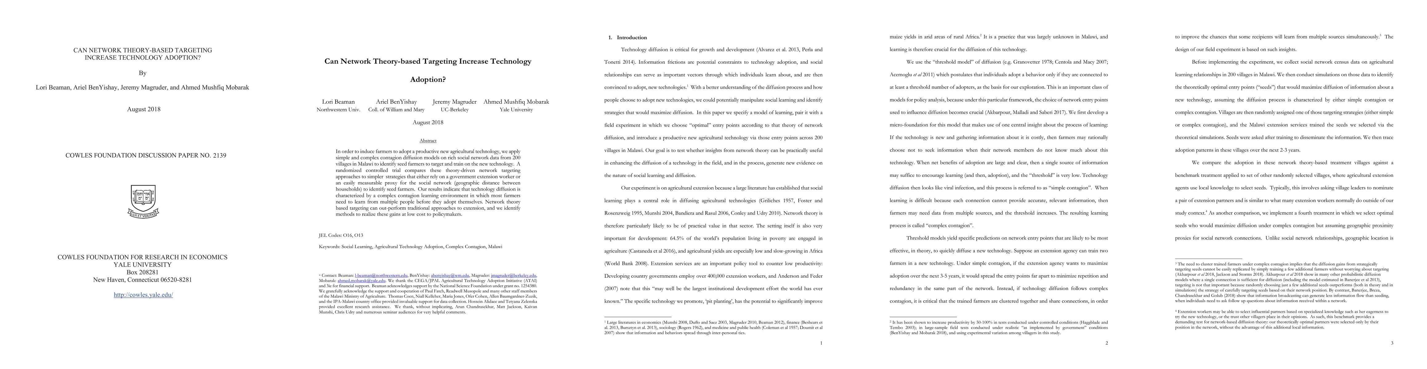 This study investigates whether network theory-based targeting can enhance the adoption of new agricultural technology among farmers in Malawi. Results show that complex contagion models outperform traditional methods, indicating that farmers learn from multiple sources, and network-driven strategies can achieve higher technology diffusion at low cost.