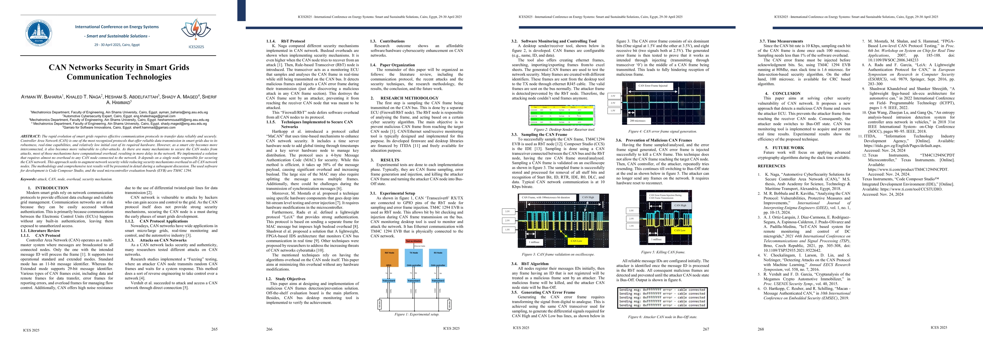 The rapid evolution of smart grids requires effective communication protocols to transfer data reliably and securely. Controller Area Network (CAN) is one of the most recognized protocols that offer reliable data transmission in smart grids due to its robustness, real-time capabilities, and relatively low initial cost of its required hardware. However, as a smart city becomes more interconnected, it also becomes more vulnerable to cyber-attacks. As there are many mechanisms to secure the CAN nodes from attacks, most of those mechanisms have computational overhead, resulting in more delay in the network. We implemented a solution that requires almost no overhead to any CAN node connected to the network. It depends on a single node responsible for securing the CAN network. This approach seeks to augment network security while reducing security mechanisms overhead to all CAN network nodes. The methodology and comprehensive test results will be presented in detail during a subsequent discussion. The used software for development is Code Composer Studio, and the used microcontroller evaluation boards (EVB) are TM4C 1294.