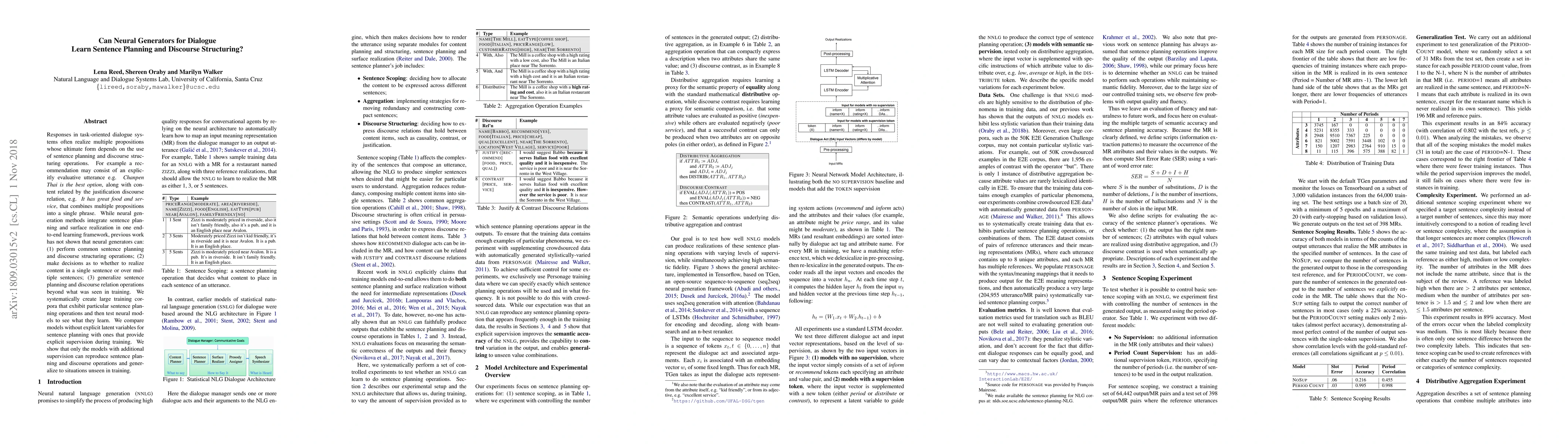 Responses in task-oriented dialogue systems often realize multiple propositions whose ultimate form depends on the use of sentence planning and discourse structuring operations. For example a recommendation may consist of an explicitly evaluative utterance e.g. Chanpen Thai is the best option, along with content related by the justification discourse relation, e.g. It has great food and service, that combines multiple propositions into a single phrase. While neural generation methods integrate sentence planning and surface realization in one end-to-end learning framework, previous work has not shown that neural generators can: (1) perform common sentence planning and discourse structuring operations; (2) make decisions as to whether to realize content in a single sentence or over multiple sentences; (3) generalize sentence planning and discourse relation operations beyond what was seen in training. We systematically create large training corpora that exhibit particular sentence planning operations and then test neural models to see what they learn. We compare models without explicit latent variables for sentence planning with ones that provide explicit supervision during training. We show that only the models with additional supervision can reproduce sentence planing and discourse operations and generalize to situations unseen in training.