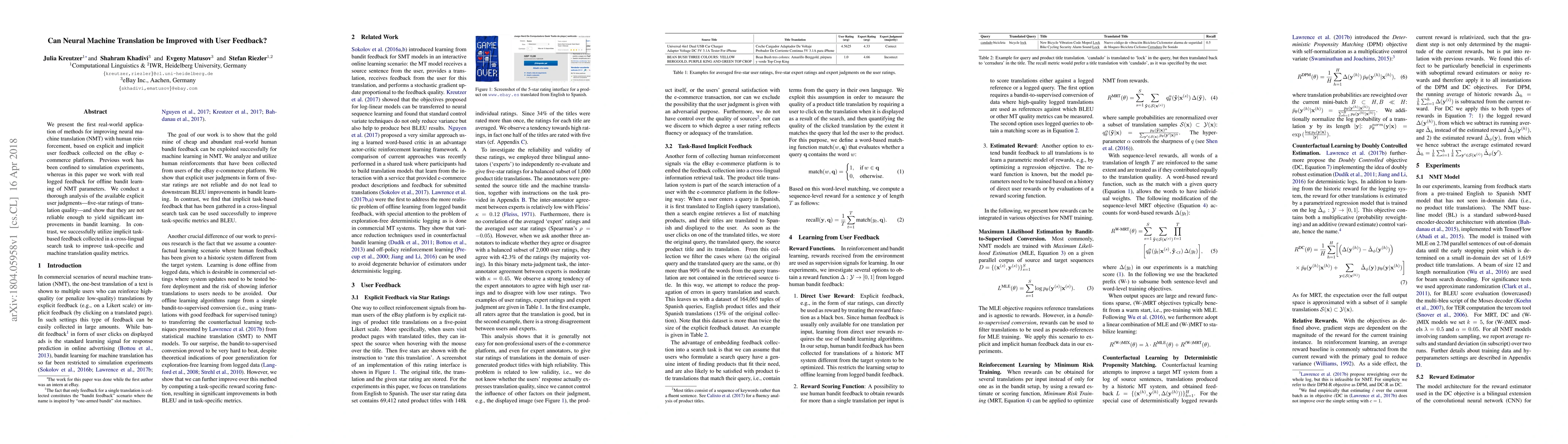 We present the first real-world application of methods for improving neural machine translation (NMT) with human reinforcement, based on explicit and implicit user feedback collected on the eBay e-commerce platform. Previous work has been confined to simulation experiments, whereas in this paper we work with real logged feedback for offline bandit learning of NMT parameters. We conduct a thorough analysis of the available explicit user judgments---five-star ratings of translation quality---and show that they are not reliable enough to yield significant improvements in bandit learning. In contrast, we successfully utilize implicit task-based feedback collected in a cross-lingual search task to improve task-specific and machine translation quality metrics.