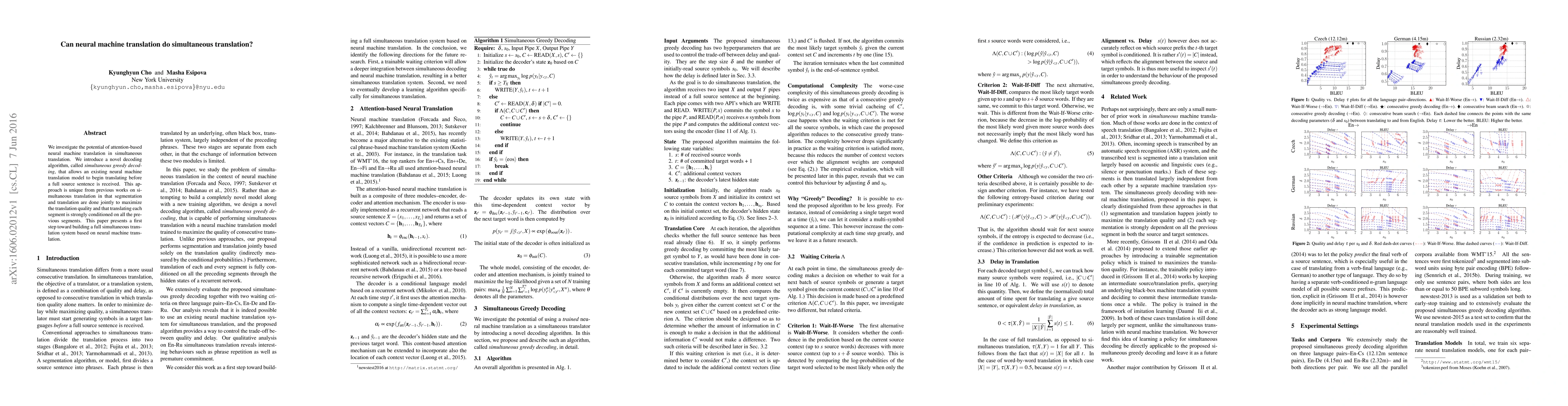 This paper explores the feasibility of neural machine translation for simultaneous translation using a novel simultaneous greedy decoding algorithm, which translates segments jointly and conditioned on previous segments to maximize translation quality. This marks an initial step toward developing a complete simultaneous translation system.