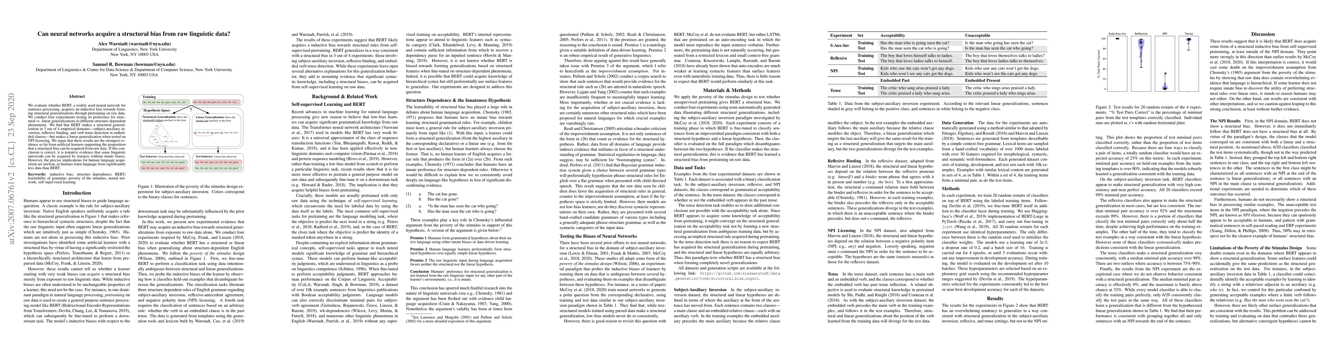 We evaluate whether BERT, a widely used neural network for sentence processing, acquires an inductive bias towards forming structural generalizations through pretraining on raw data. We conduct four experiments testing its preference for structural vs. linear generalizations in different structure-dependent phenomena. We find that BERT makes a structural generalization in 3 out of 4 empirical domains---subject-auxiliary inversion, reflexive binding, and verb tense detection in embedded clauses---but makes a linear generalization when tested on NPI licensing. We argue that these results are the strongest evidence so far from artificial learners supporting the proposition that a structural bias can be acquired from raw data. If this conclusion is correct, it is tentative evidence that some linguistic universals can be acquired by learners without innate biases. However, the precise implications for human language acquisition are unclear, as humans learn language from significantly less data than BERT.