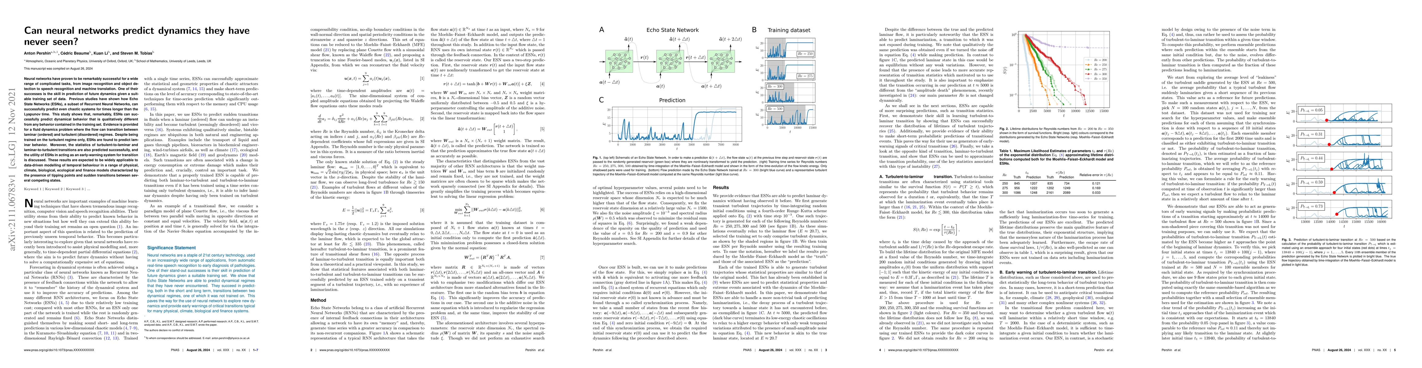 Neural networks have proven to be remarkably successful for a wide range of complicated tasks, from image recognition and object detection to speech recognition and machine translation. One of their successes is the skill in prediction of future dynamics given a suitable training set of data. Previous studies have shown how Echo State Networks (ESNs), a subset of Recurrent Neural Networks, can successfully predict even chaotic systems for times longer than the Lyapunov time. This study shows that, remarkably, ESNs can successfully predict dynamical behavior that is qualitatively different from any behavior contained in the training set. Evidence is provided for a fluid dynamics problem where the flow can transition between laminar (ordered) and turbulent (disordered) regimes. Despite being trained on the turbulent regime only, ESNs are found to predict laminar behavior. Moreover, the statistics of turbulent-to-laminar and laminar-to-turbulent transitions are also predicted successfully, and the utility of ESNs in acting as an early-warning system for transition is discussed. These results are expected to be widely applicable to data-driven modelling of temporal behaviour in a range of physical, climate, biological, ecological and finance models characterized by the presence of tipping points and sudden transitions between several competing states.